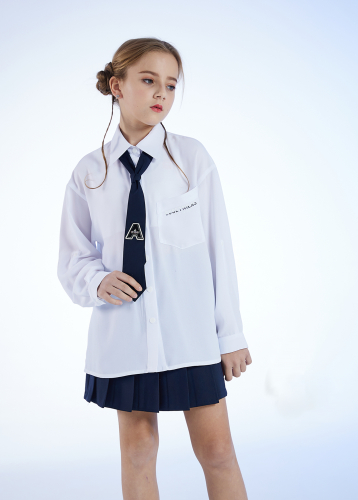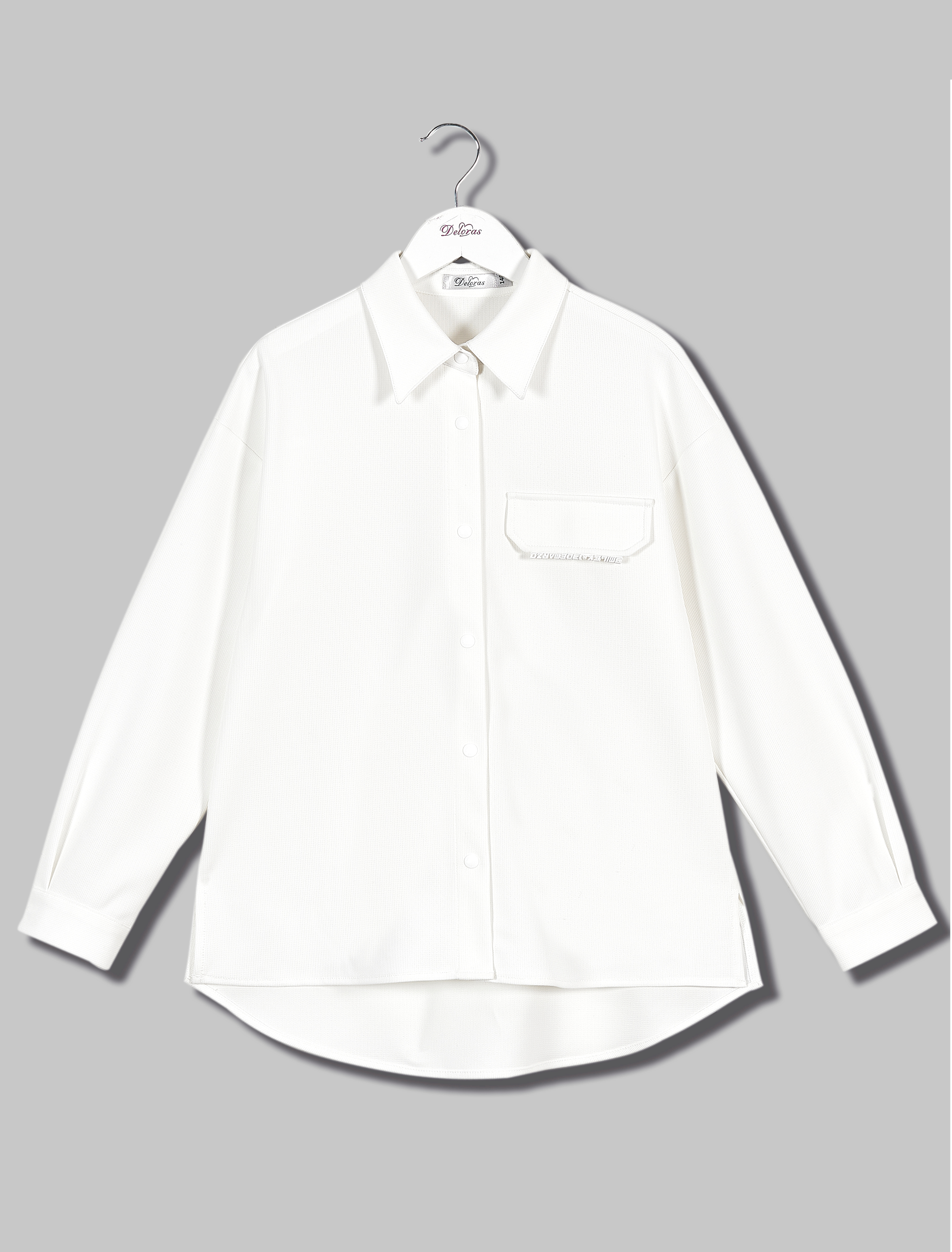 Блузка для девочки с длинным рукавом из трикотажной ткани свободного кроя. Отложной воротник. Застежка на кнопки. По клапану кармана прорезиненная надпись.