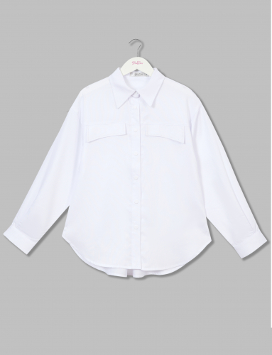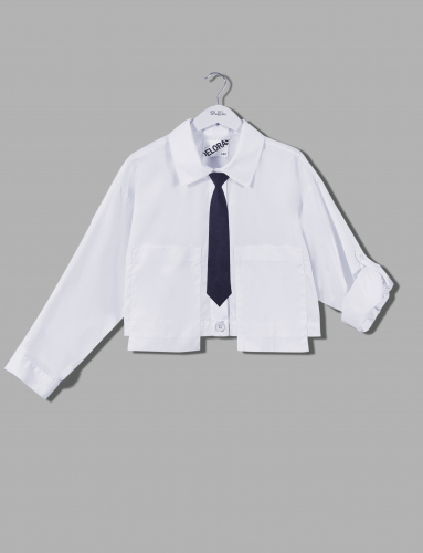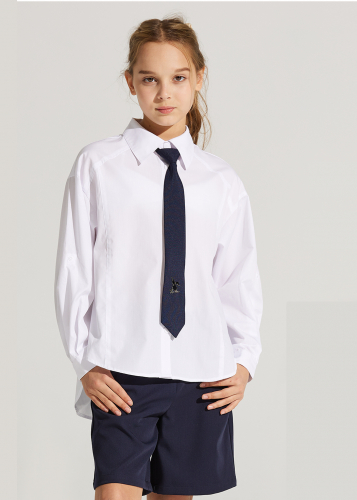 Блузка для девочки с длинным рукавом из хлопковой ткани укороченного кроя. Отложной воротник. Застежка на пуговицы. Спущенное плечо.