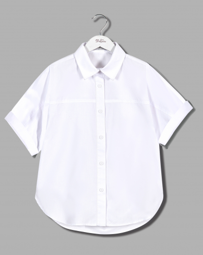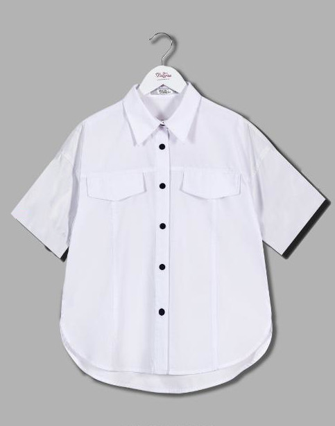 Блузка с коротким рукавом свободного кроя. Отложной воротник. Спинка без особенностей. Застежка на кнопки. Практичная вещь на каждый день. Спущенное плечо. Рукав короткий.  Клапаны карманов.