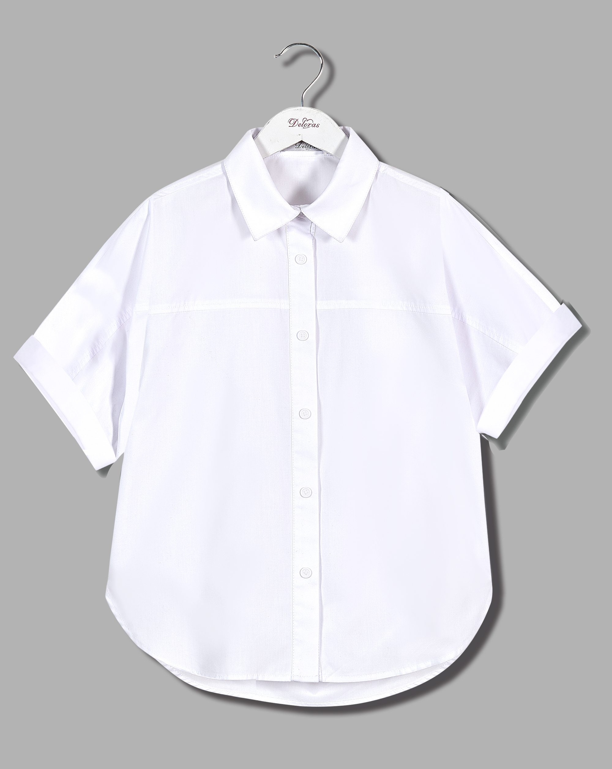 Блузка с коротким рукавом свободного кроя из хлопковой ткани. Отложной воротник. Спинка на кокетке с защипом по середине. Застежка на кнопки. Практичная вещь на каждый день. Рукав реглан с поворотом.