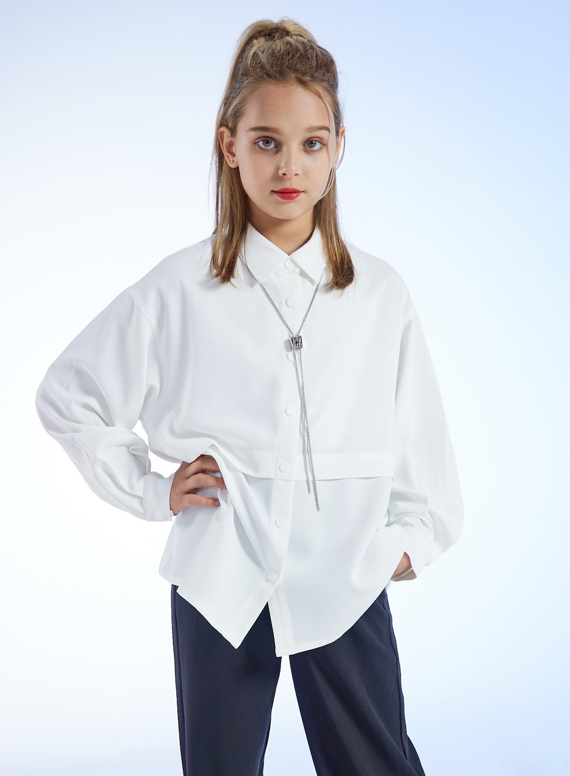 Блузка для девочки с длинным рукавом из вискозной ткани свободного кроя. Отложной воротник. Ткань шифон. Застежка на кнопки. Комбинирование тканей по структуре. Цепочка в комплект не входит.