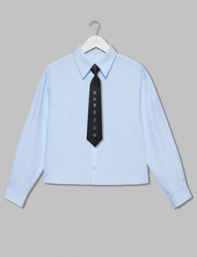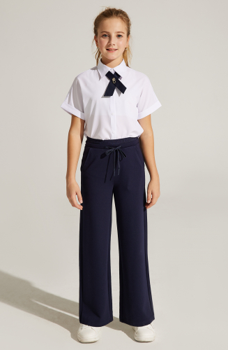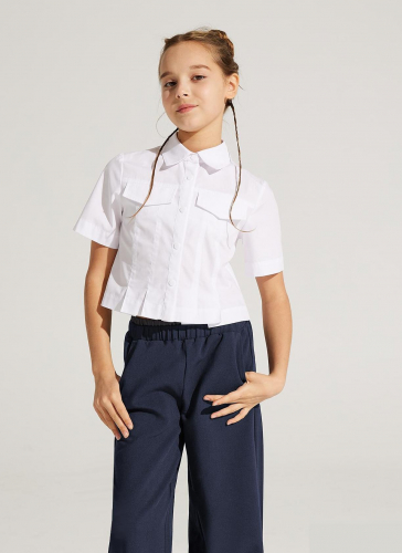 Блузка для девочки с коротким рукавом из хлопковой ткани укороченного кроя. Отложной воротник. Застежка на кнопки. Карманы-обманки.