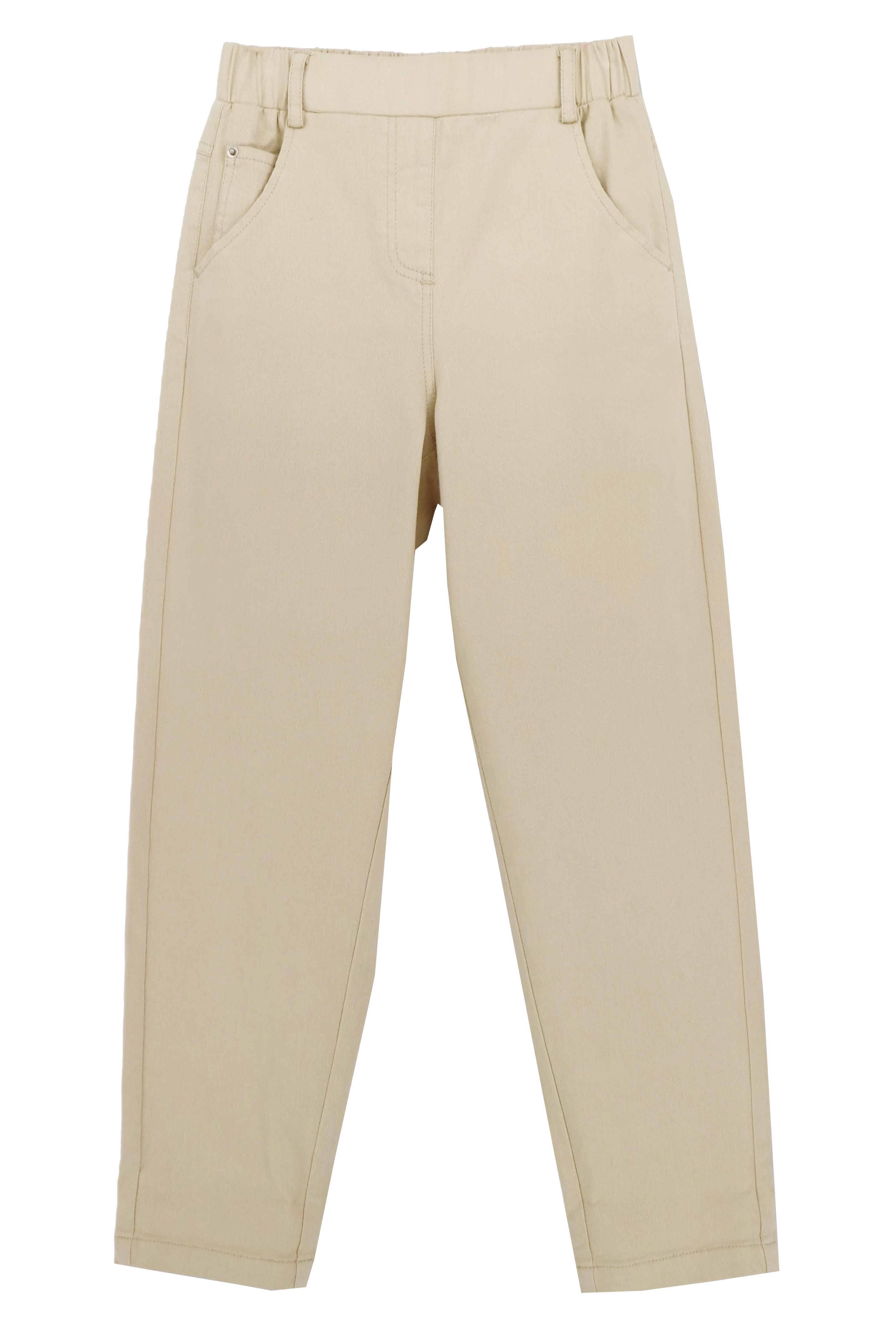Брюки для девочки из плотной ткани типа джинса. Пояс на резинке. Функциональные карманы.  Крой не узкий. Низ можно подкатать.