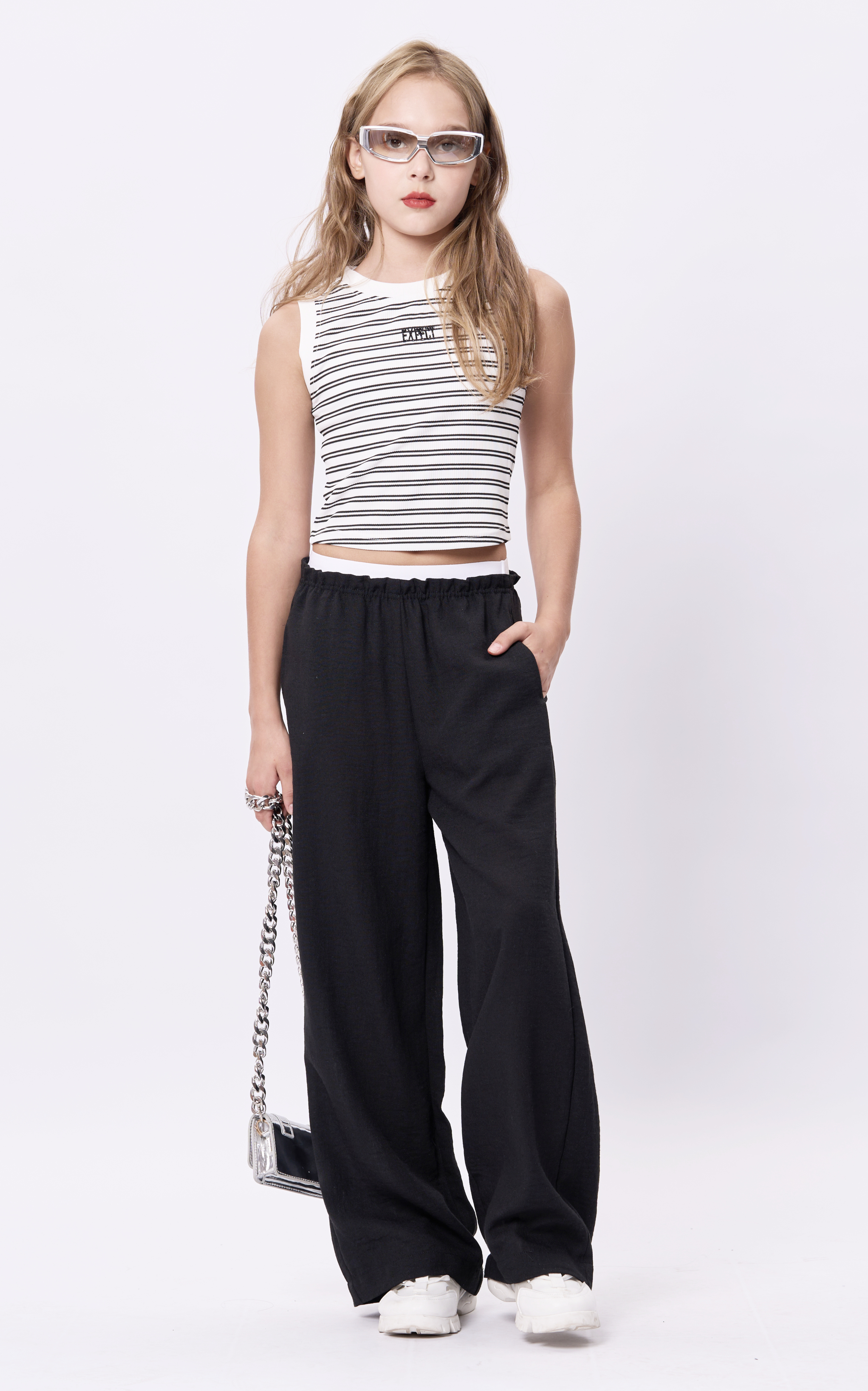 Брюки для девочки из тонкой ткани. Пояс на резинке белого цвета. Функциональные карманы. Сезон лето.