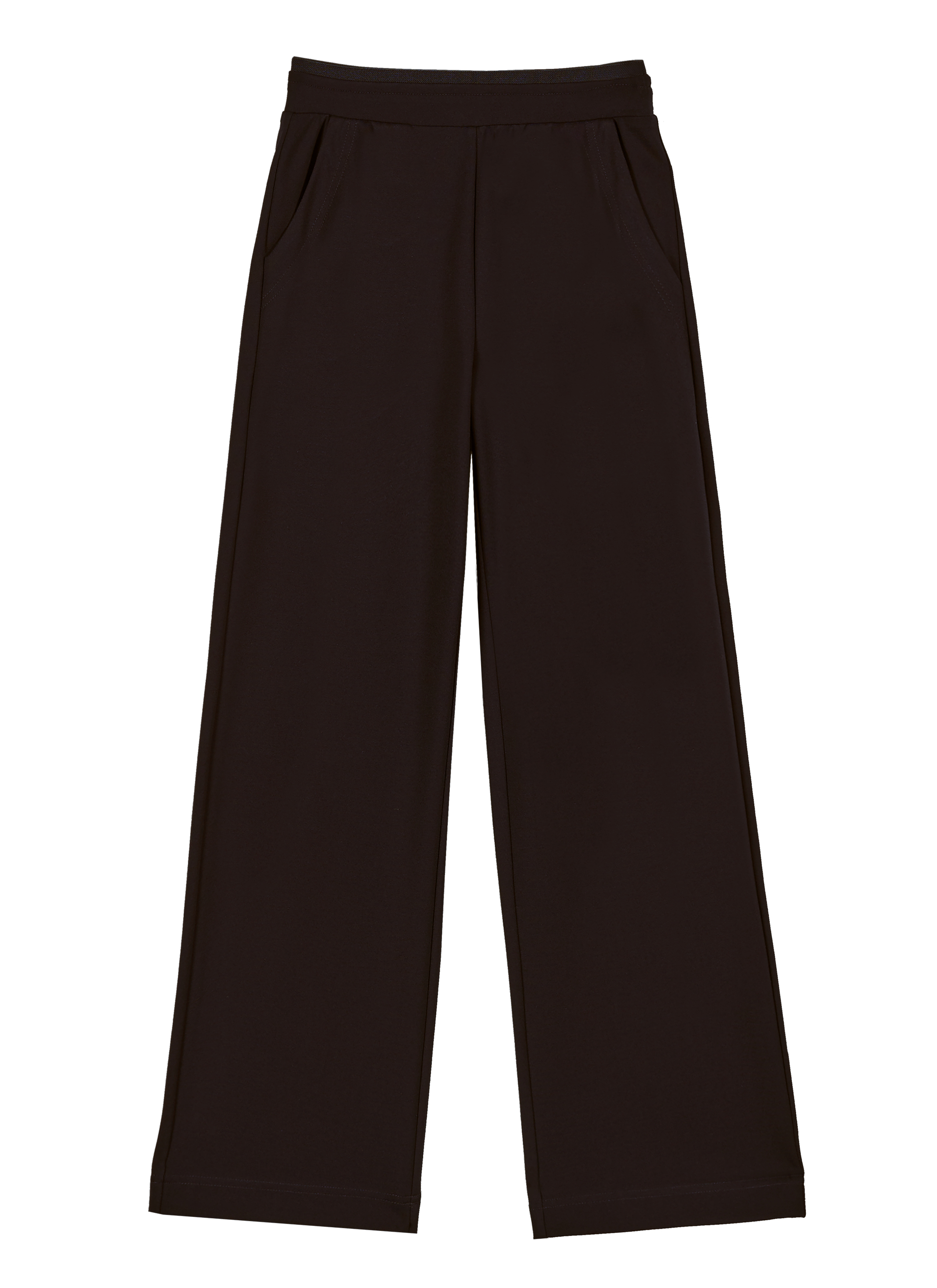 Прямые брюки из трикотажного полотна высокого качества с добавлением эластана.  Пояс на резинке. Прорезные карманы. Пошив безупречный.