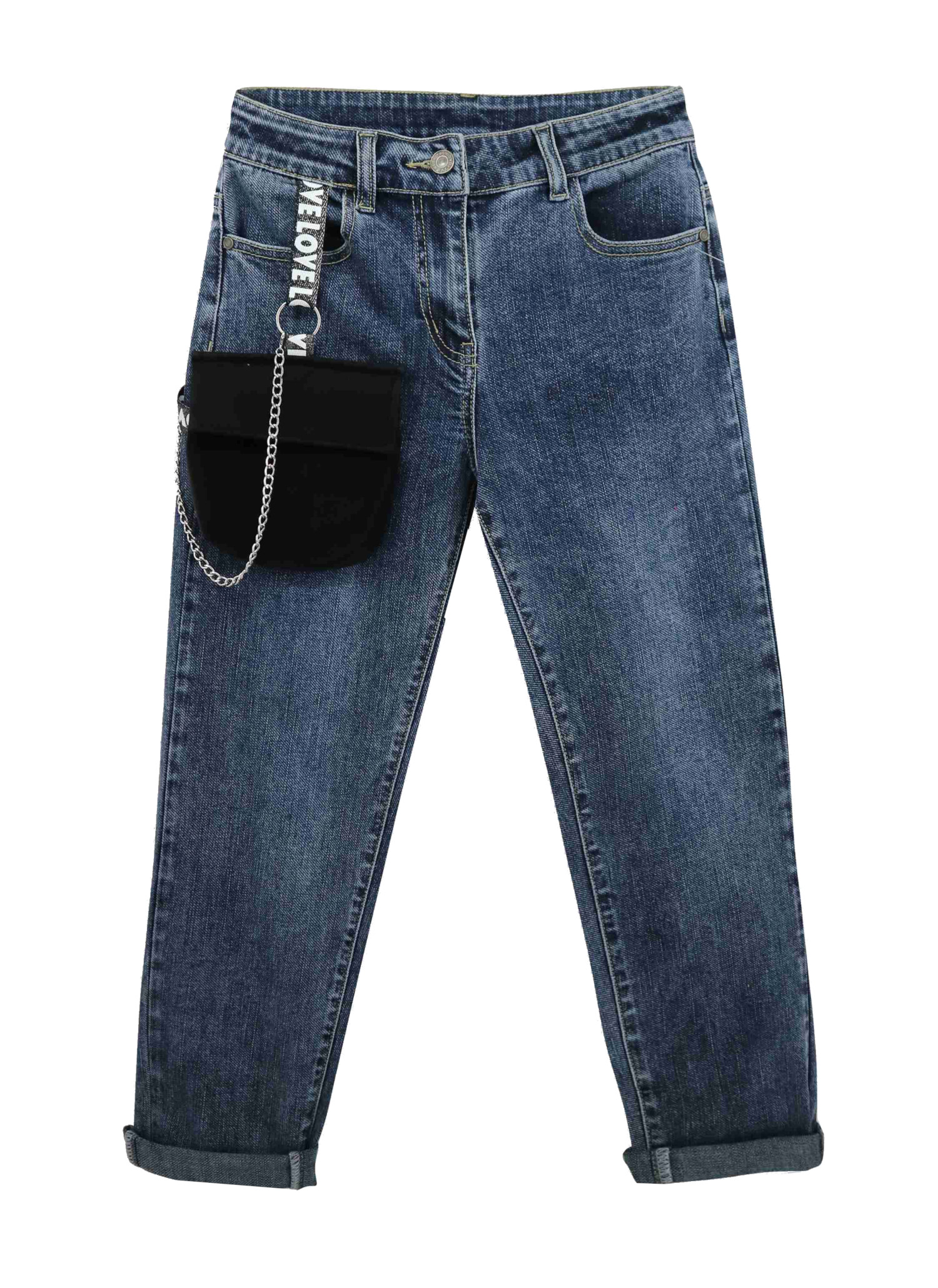 Джинсы для девочки с обычной талией, но не низкой. Пояс регулируется потайной резинкой. Функциональные карманы. Дополнен сумочкой из ткани.  Крой не узкий, прямой. П низу можно не подворачивать, длина до стопы.