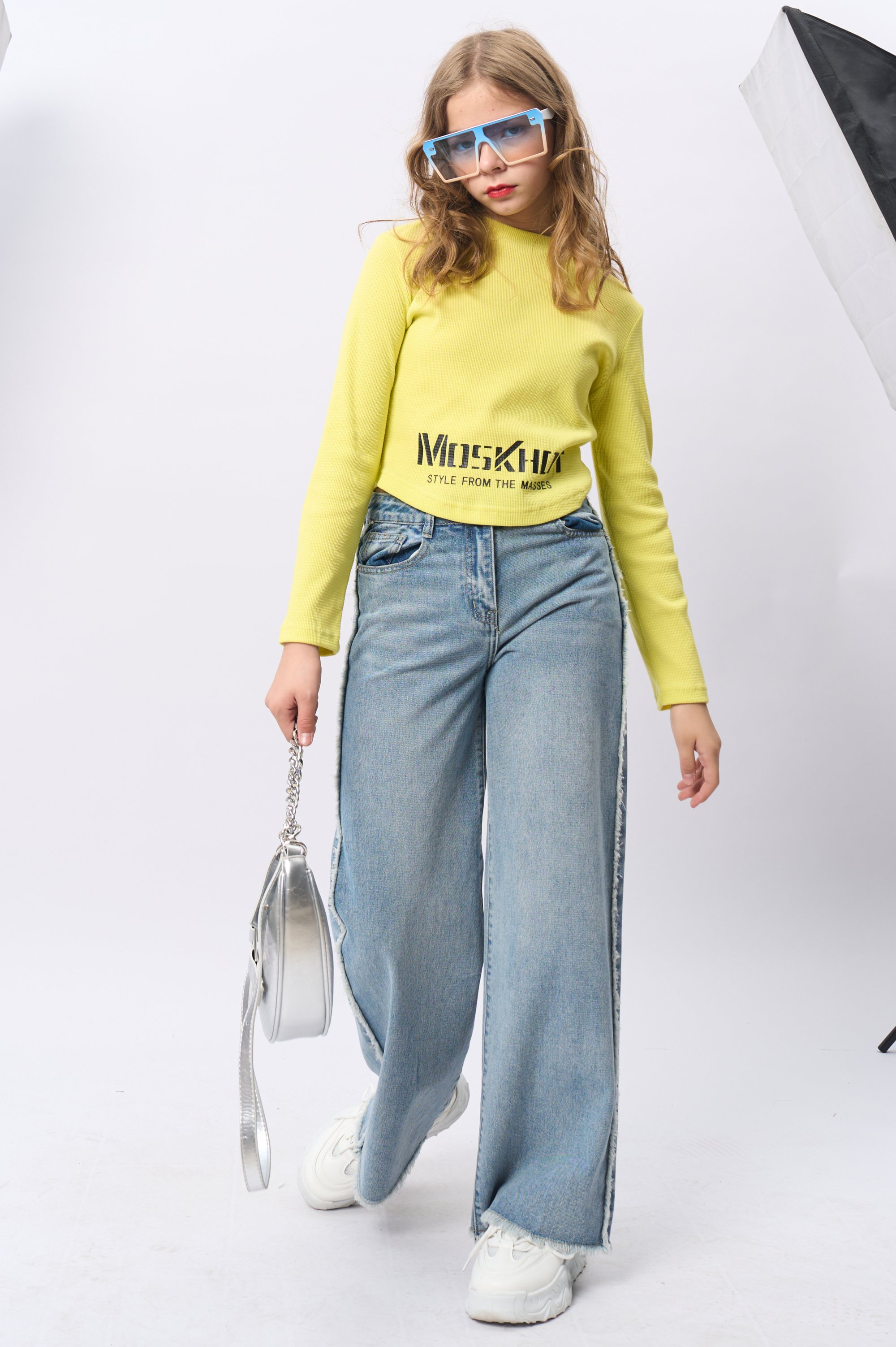 Колоты для девочки из джинсовой ткани. Ширина пояса регулируется потайной резинкой. Функциональные карманы.