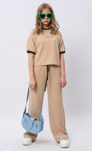 Комплект для девочки в спортивном стиле. Футболкасвободного кроя со спущенным плечом. Брюки-кюлоты на поясе резинке с функциональными карманами. Ткань средней плотности.
