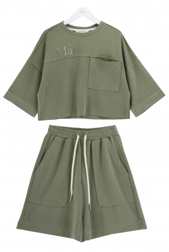 Летний комплект для девочки. Футболка свободного кроя, дополнена шевроном.  Шорты на поясе резинке. Карманы функциональные.