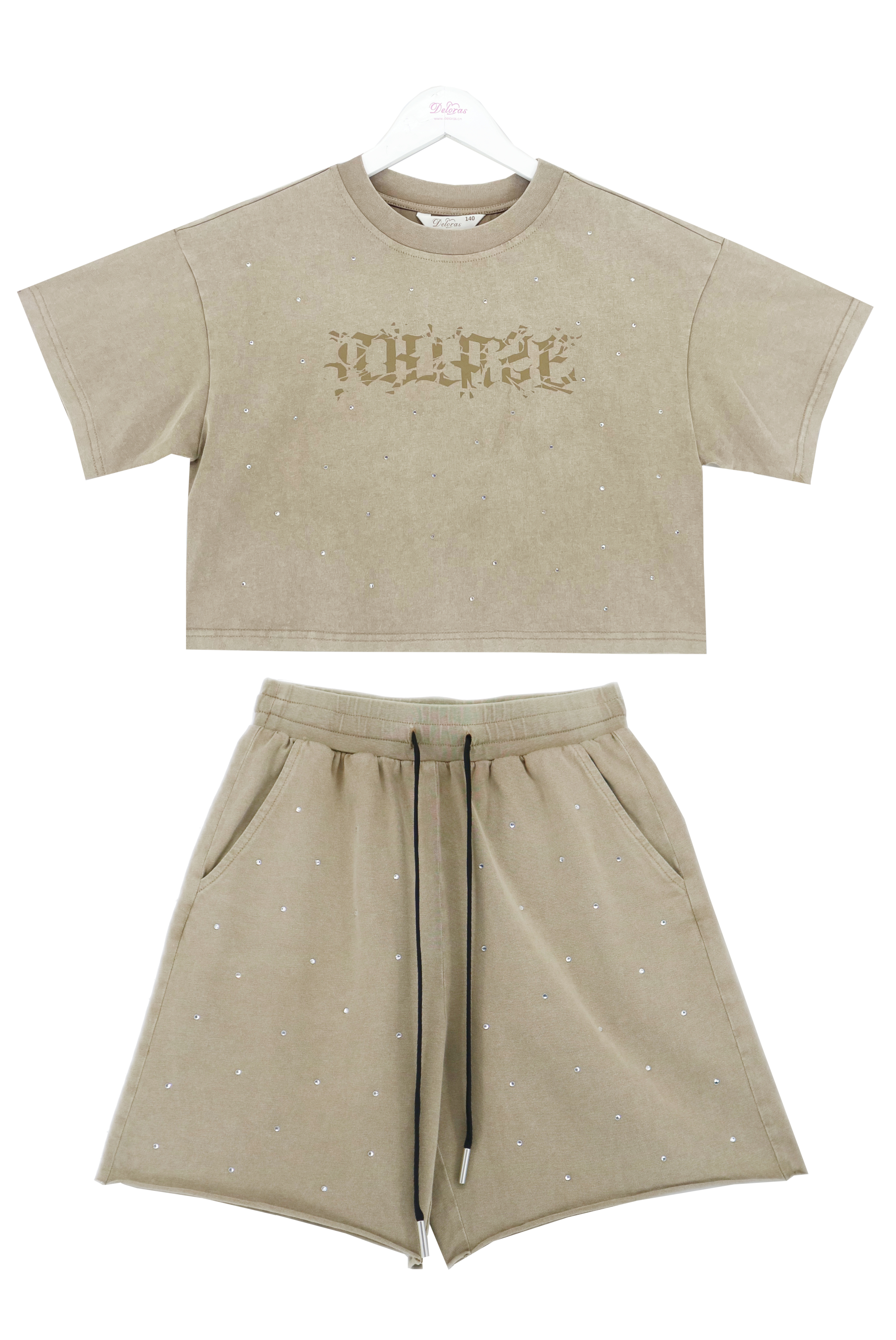 Летний комплект для девочки. Футболка свободного кроя, дополнена принтом и стразами.  Шорты на поясе резинке. Карманы функциональные.