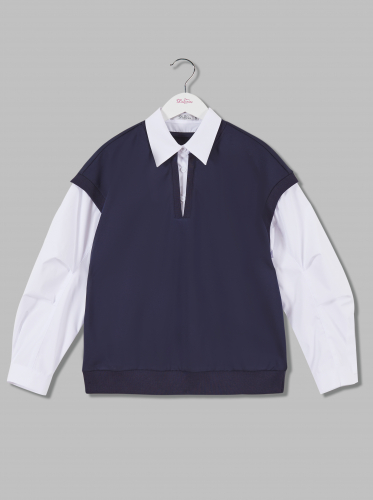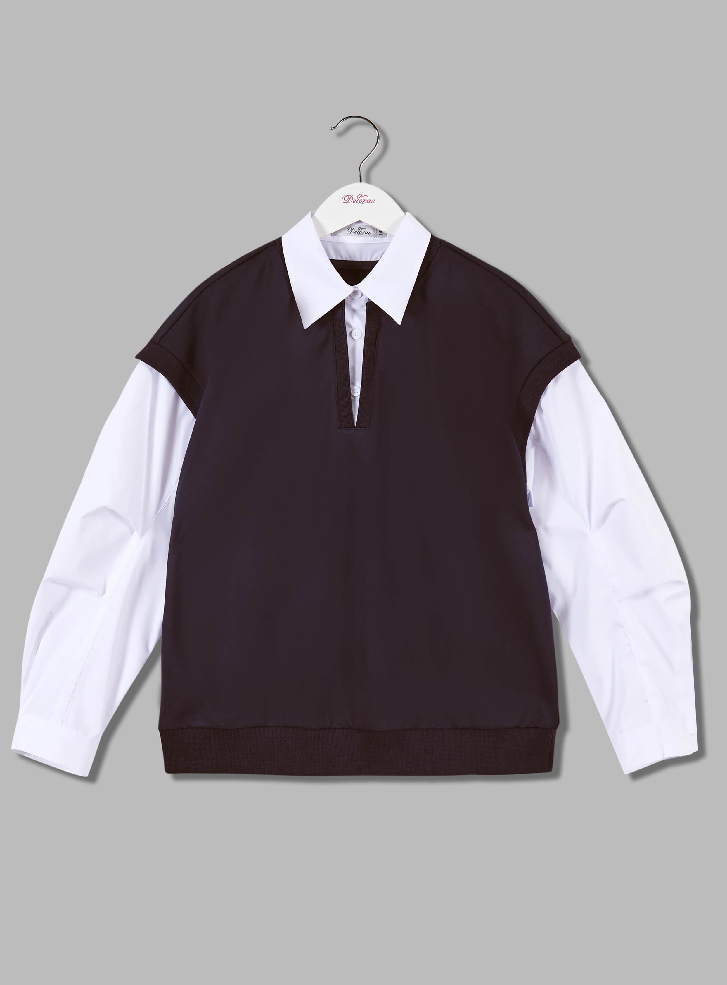 Джемпер-обманка для девочки из трикотажного полотна высокого качества с добавлением эластана.  Основная ткань -  трикотаж с добавлением эластана. Рукав и воротник из блузочной ткани. Спущенное плечо.