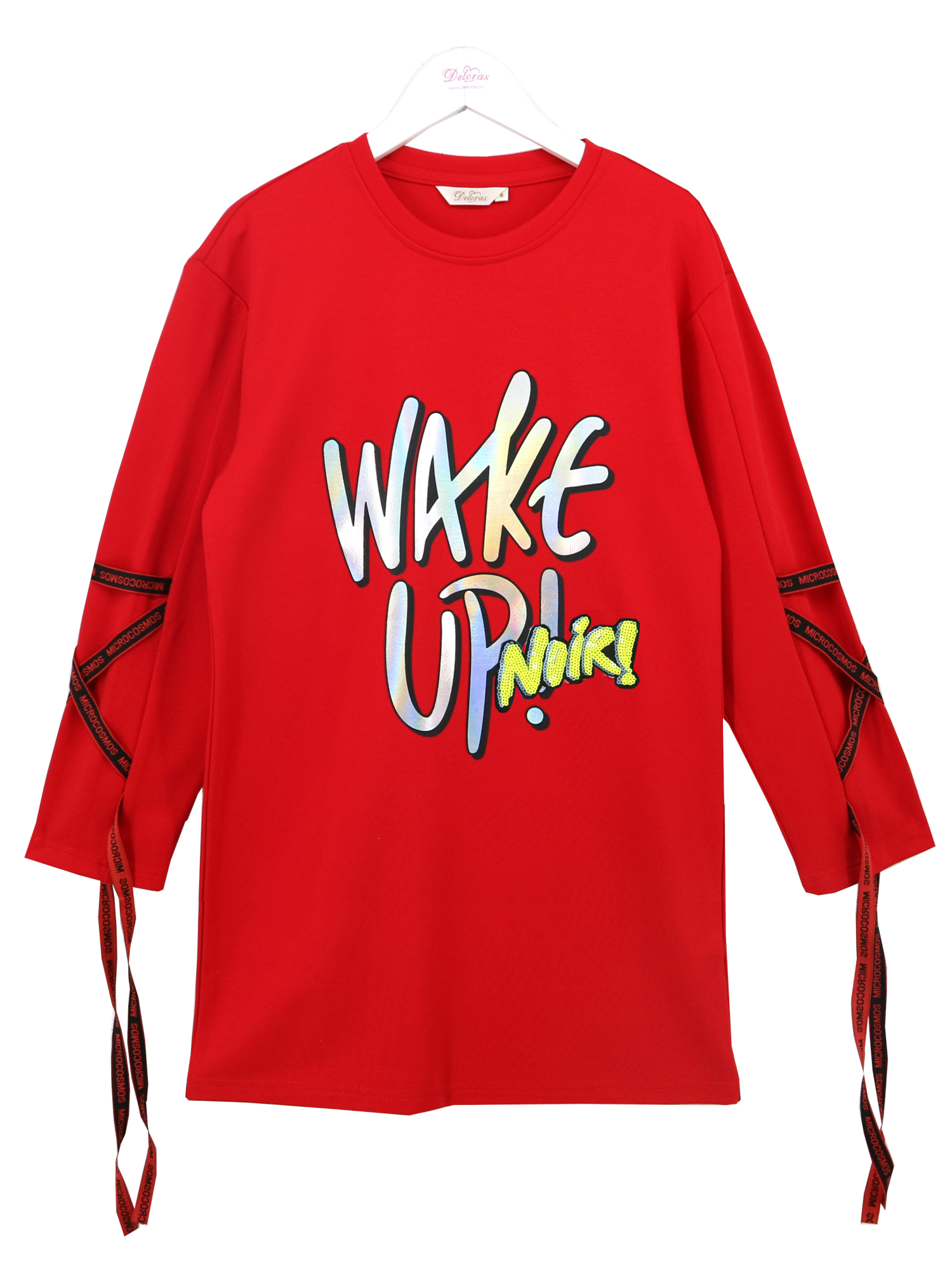 Модное платье с длинным рукавом для девочек. Изделие выполнено из высококачественного трикотажа. Модель дополнена лентами по рукавам и принтом. Спинка без особенностей.