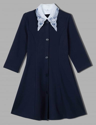 Платье для девочки из трикотажной тк..показатьани. Приталенный крой. Воротник отстегивается, можно носить без него. Ремень может отличаться от фото.