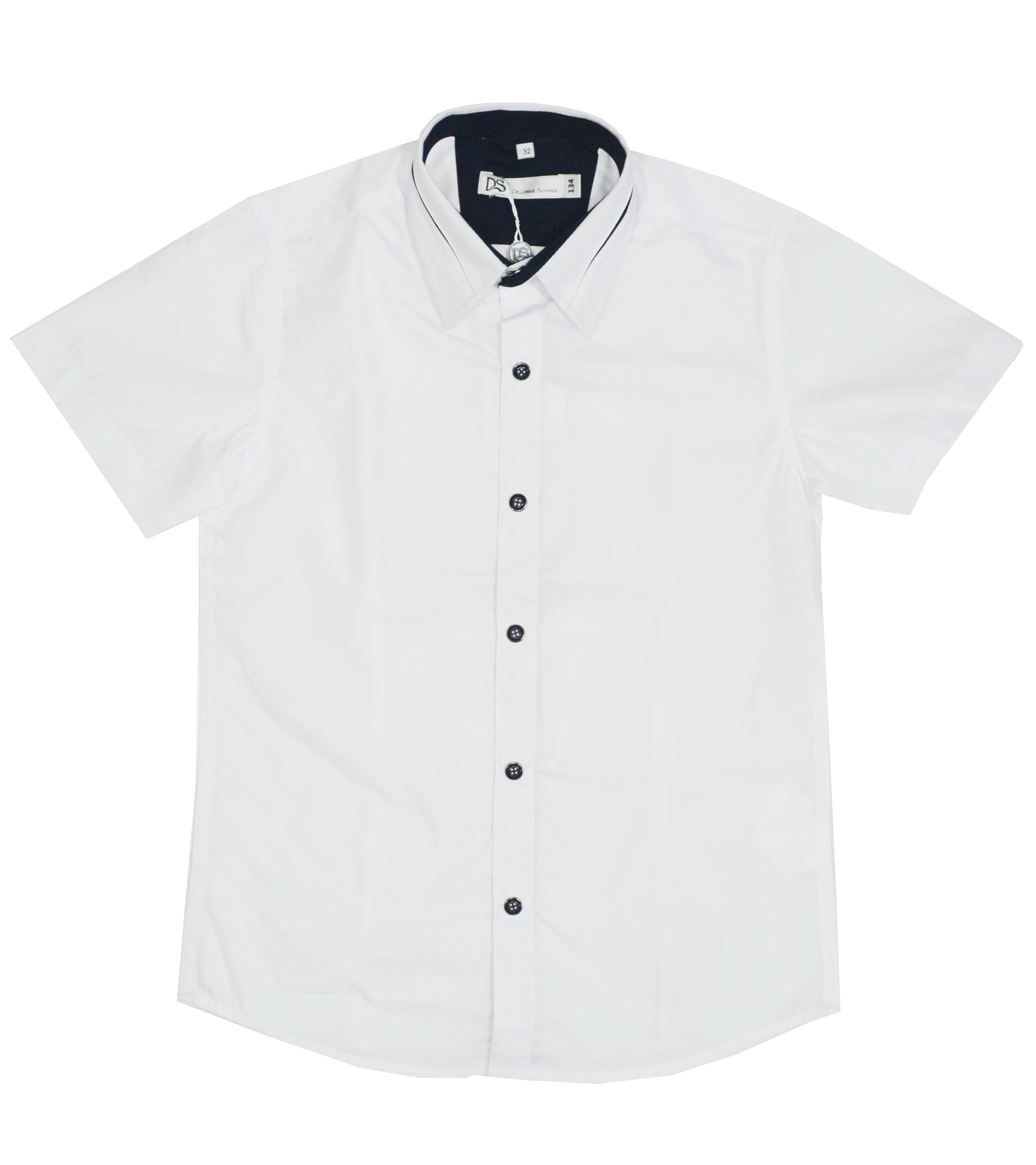 Классическая рубашка для мальчика с коротким рукавом. Застежка на кнопки, по виду похожие на пуговицы. Приталенная, по спинке вытачки. Подворотник контрастный по цвету. Материал высокого качества, гладкий и плотный, не просвечивает. По воротнику вставка, контрастная по цвету.