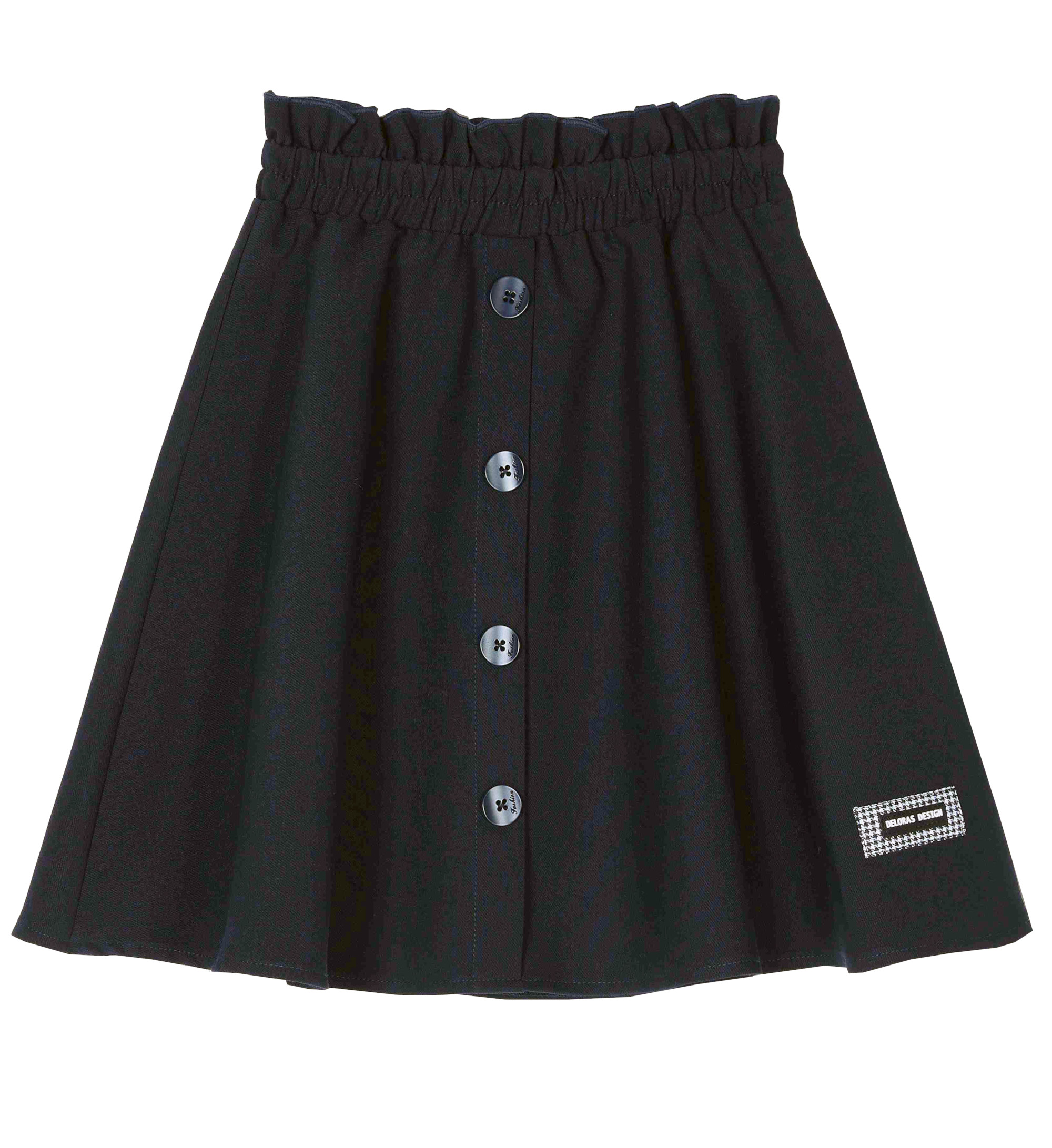 Юбка школьная для девочки. Пояс собран на широкую  резинку. Застежка-обманка,  пуговицы на ней темно-синего цвета. По низу нашит шеврон.
