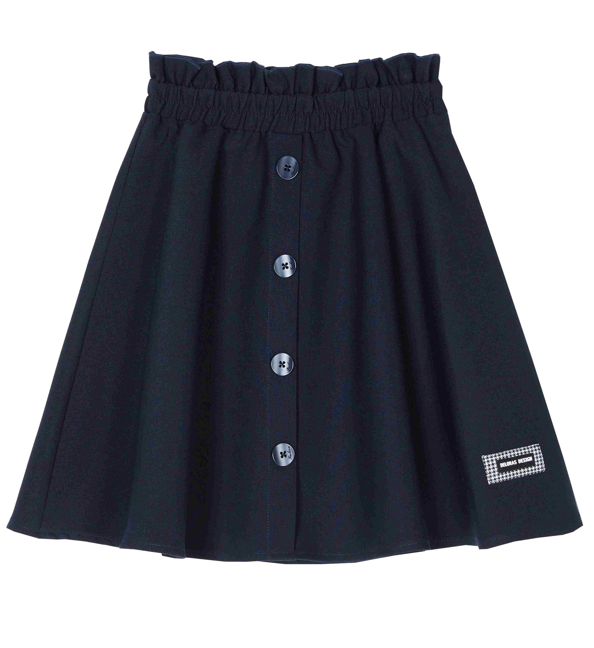 Юбка школьная для девочки. Пояс собран на широкую  резинку. Застежка-обманка,  пуговицы на ней темно-синего цвета. По низу нашит шеврон.