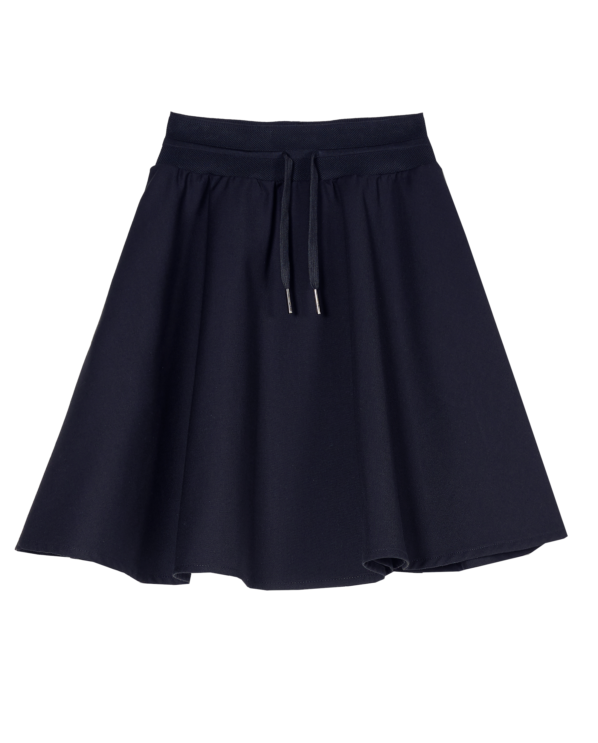 Юбка-солнце для девочки из костюмной ткани с добавлением эластана. Пояс на трикотажной резинке, дополнен шнурком. В боковых швах карманы Без подклада.