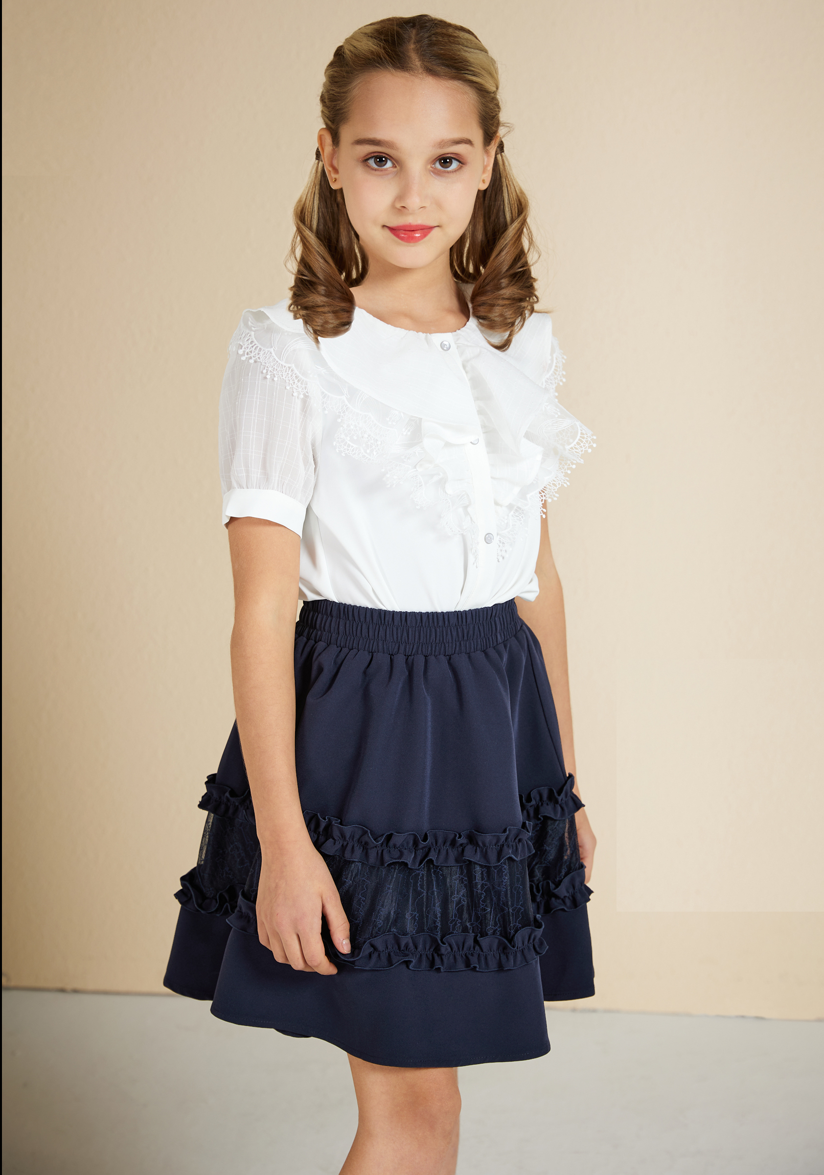 Юбка-солнце для девочки из костюмной ткани с добавлением эластана. Пояс на резинке. Дополнена вставками из гипюра и рюшей. Юбка на подкладе.