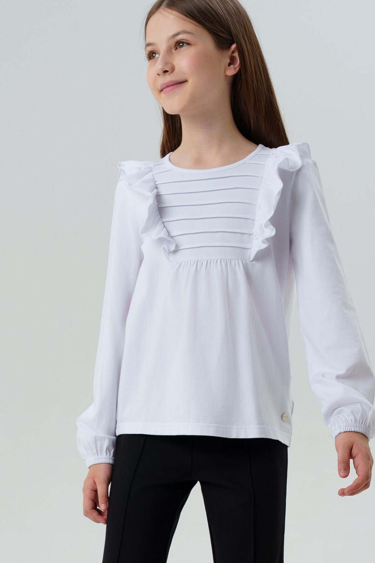 Белая нарядная блузка для школы Идеальный вариант на 1 сентября и для повседневной носки! Эта трикотажная блузка сочетает нарядный дизайн и комфорт для учебы.