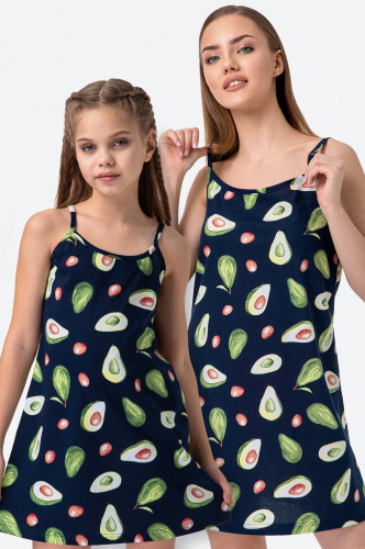 Детская сорочка для девочек и девочек-подростков выполнена из натурального 100% хлопка. Аккуратные тонкие бретели, удобный А-силуэт и длина выше колена – каждая деталь создана для комфорта ребенка. Сорочка для детей представлена в спокойном синем цвете и украшена принтом авокадо.