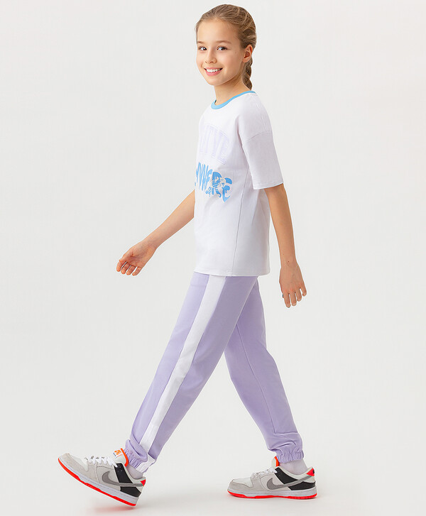 Светло-фиолетовые джоггеры для девочки подростка с поясом на резинке и с контрастными лампасами. Функциональные завязки на поясе помогут скорректировать посадку индивидуально по фигуре. Для удобства трикотажные брюки оснащены двумя прорезными карманами. Мягкая хлопковая ткань с добавлением эластана обеспечивает качественный воздухообмен, позволяя телу дышать, и сохраняет форму изделия даже после длительной носки. Джоггеры из футера имеют гладкую лицевую сторону и приятную на ощупь петельчатую изнанку. Свободные штанины слегка заужены к низу и оснащены эластичными манжетами. Благодаря прямому крою и посадке без облегания брюки оптимальны для активных движений, поэтому можно смело включать их как в повседневные, так и в спортивные образы. Белые широкие лампасы добавляют стильный акцент в общий дизайн. Модель пастельного оттенка идеально комбинируется с разнообразием одежды из коллекции Button Blue.