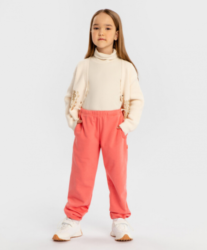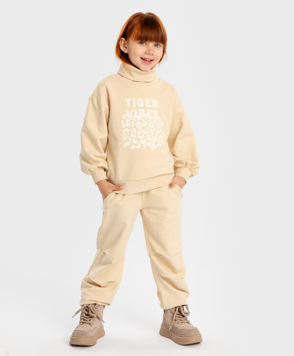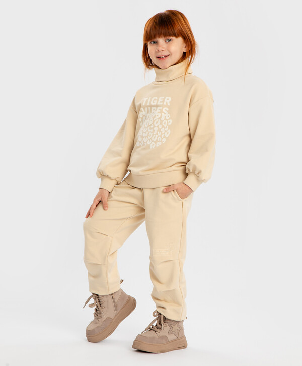 5% эластан цветБежевый95% хлопок/5% эластан Хлопок Джоггеры с защипами на коленях, поясом на резинке и принтом бежевые для девочки Button Blue