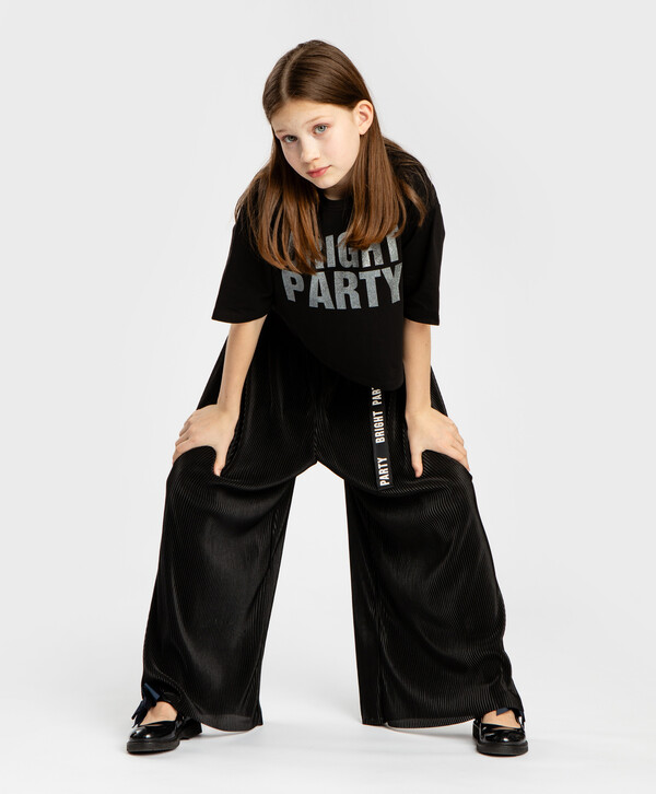 5% эластан цветЧерныйверх:100% полиэстер; подкладка:95% хлопок/5% эластан Полиэстер Брюки палаццо с плиссировкой и поясом на резинке черные для девочки Button Blue
