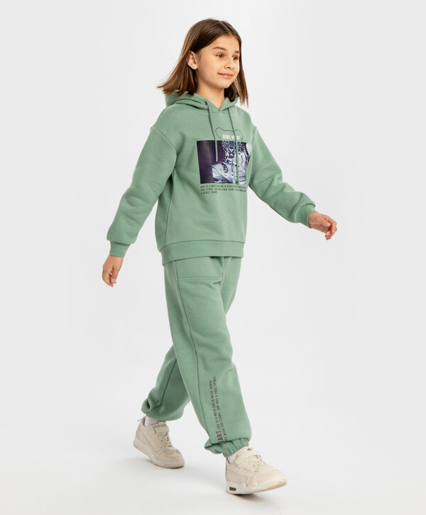 30% полиэстер цветЗеленый70% хлопок/30% полиэстер Хлопок Джоггеры утепленные с поясом на резинке и принтом зеленые для девочки Button Blue