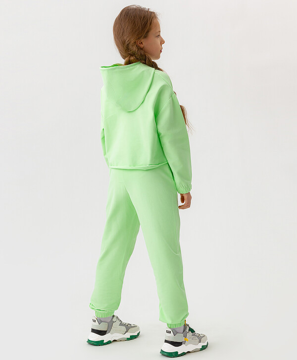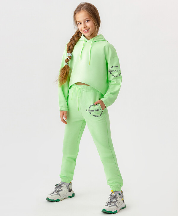 Светло-зеленые джоггеры для девочки подростка с поясом на резинке и с небольшим текстовым принтом. Функциональные завязки на поясе помогут скорректировать посадку индивидуально по фигуре. Для удобства трикотажные брюки оснащены двумя прорезными карманами. Мягкая хлопковая ткань с добавлением эластана обеспечивает качественный воздухообмен, позволяя телу дышать, и сохраняет форму изделия даже после длительной носки. Джоггеры из футера имеют гладкую лицевую сторону и приятную на ощупь петельчатую изнанку. Свободные штанины слегка заужены к низу и оснащены эластичными манжетами. Благодаря прямому крою и посадке без облегания брюки оптимальны для активных движений, поэтому можно смело включать их как в повседневные, так и в спортивные образы. Круговой текстовый принт на левой штанине спереди добавляет стильный акцент в общий дизайн. Модель идеально комбинируется с разнообразием одежды из коллекции Button Blue.