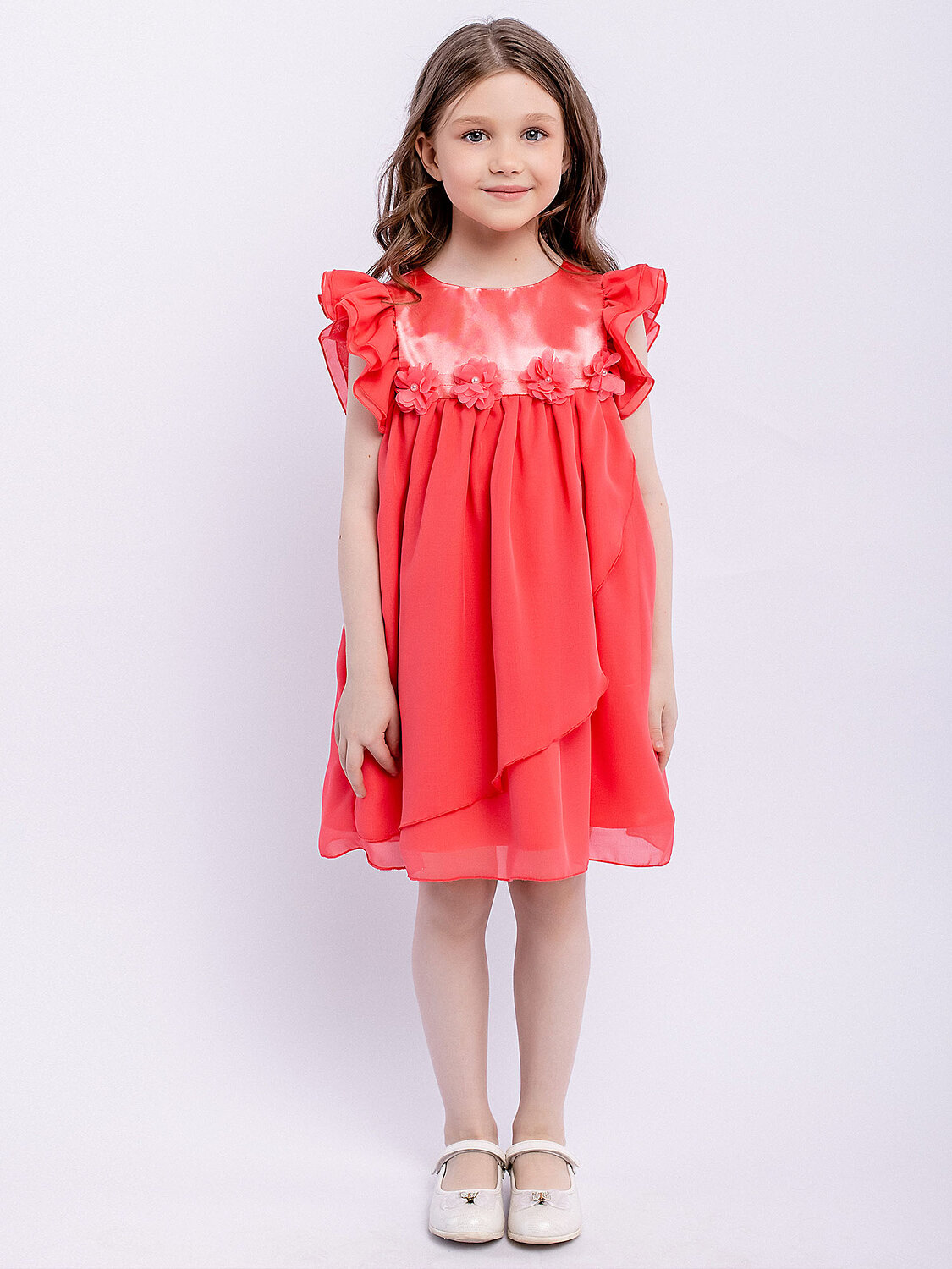 Нарядное платье с завышеной талией из шифона с рукавами рюшами. Подкладка 100% хлопок. Красное платье с короткими рукавами. Лиф атласный блестящий, завышенная талия. На спинке имеется поясок, чтобы дополнительно утянуть талию. Аппликации в виде объемных цветов. Юбка многослойная с асимметричными слоями.