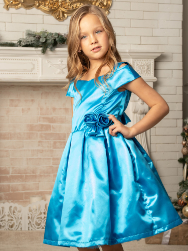 Нарядное желтое платье с пышной юбкой, декоративными цветами на поясе. Подкладка 100% хлопок. Сетка и ткань верха 100% полиэстер. Блестящее атласное платье с короткими спущенными рукавами. Однотонное платье с завязкой на спинке и декоративным цветком на поясе.