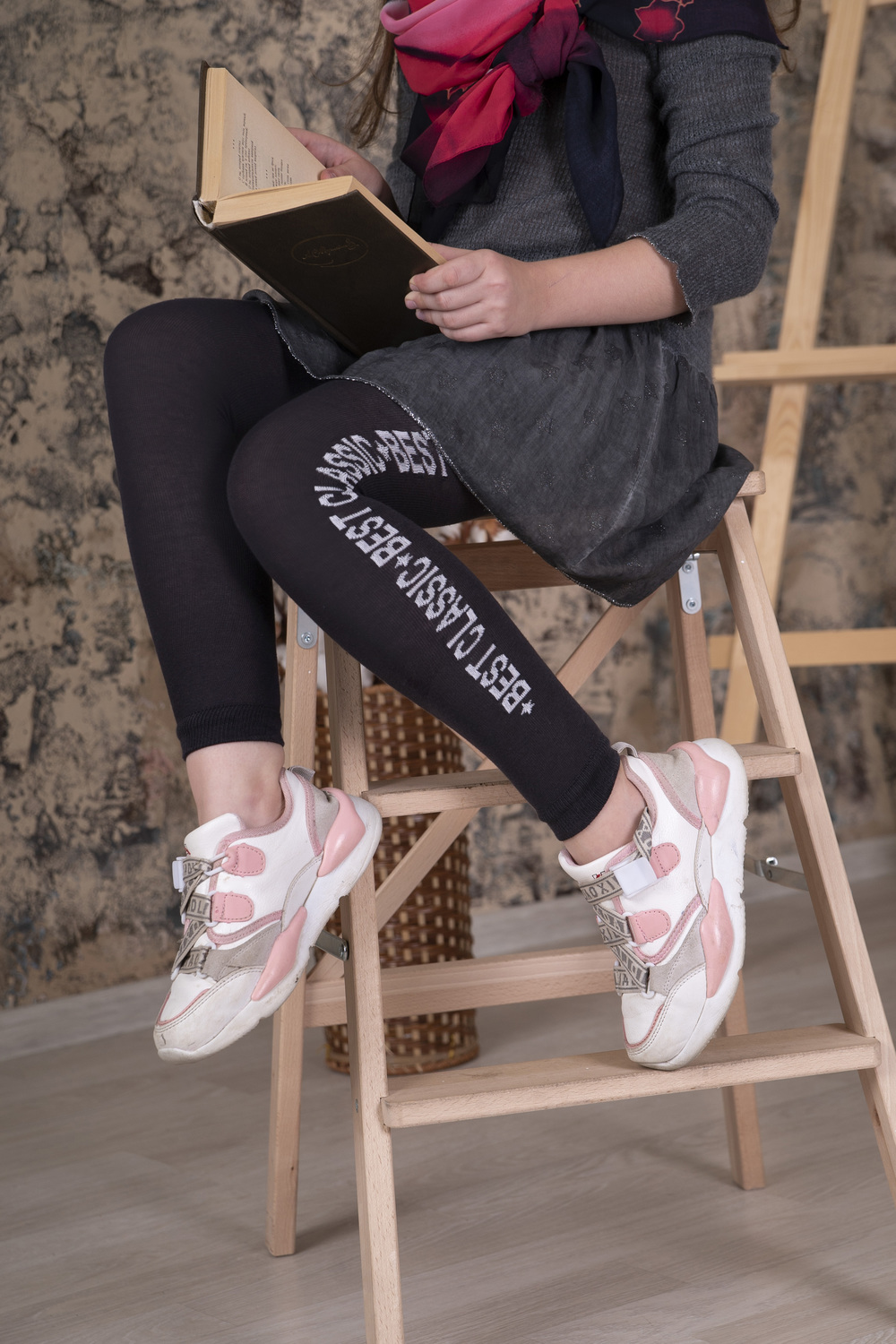Модные детские леггинсы с лампасами в виде надписей, по низу резинка Цвет: джинс;синий;графит; Материал: чулочно-носочный трикотаж;чулочно-носочный трикотаж; Состав: 73% х/б, 23% п/а, 2% п/п, 2% эластан.