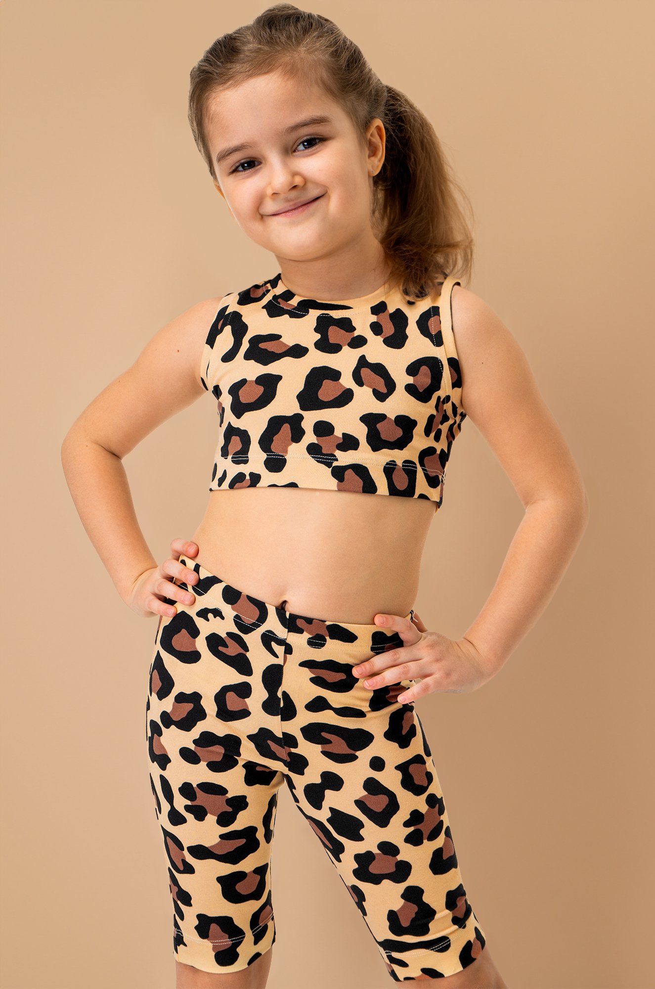 Хлопковый набор из велосипедок и топика подходит для танцев и тренировок по бегу и гимнастике. Облегающий костюмчик с принтом леопард станет отличным решением для физкультуры и детского садика. Комплект идеален для дома, отдыха и домашних дел.
