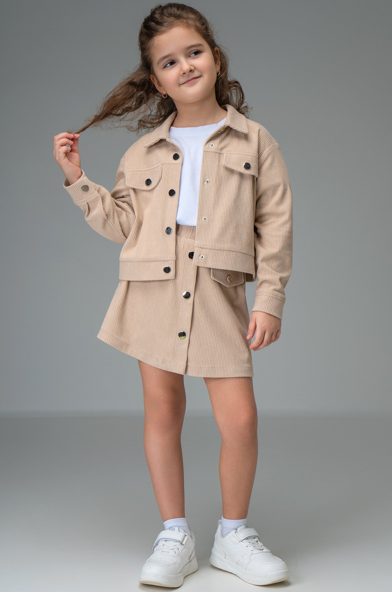 Детский вельветовый костюм двойка сочетает элегантность и комфорт. Бежевый костюм с юбкой для девочки и девочки подростка дополнит школьные образы.