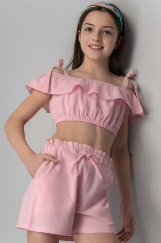 Короткий топик украшен волнистым воланом, который кокетливо спущен на плечи, придавая образу легкую игривость. Завязки позволяют регулировать посадку, создавая идеальный образ для каждой девочки. Шорты с классическим прямым кроем, поясом на резинке и утягивающимся шнурком предлагают свободу движений. Боковые карманы добавляют удобства и функциональности, что особенно важно для активных дней.