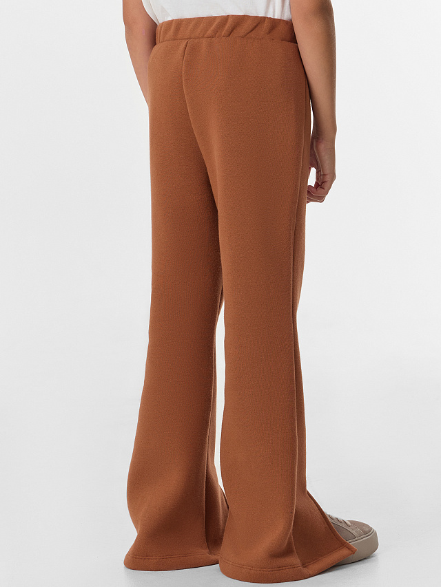 Коричневые трикотажные брюки для девочек — идеальный повседневный вариант, в котором комфорт сочетается со стильным современным силуэтом. Модель со средней посадкой мягко облегает фигуру, а эластичный пояс не стесняет движений даже во время активных игр.