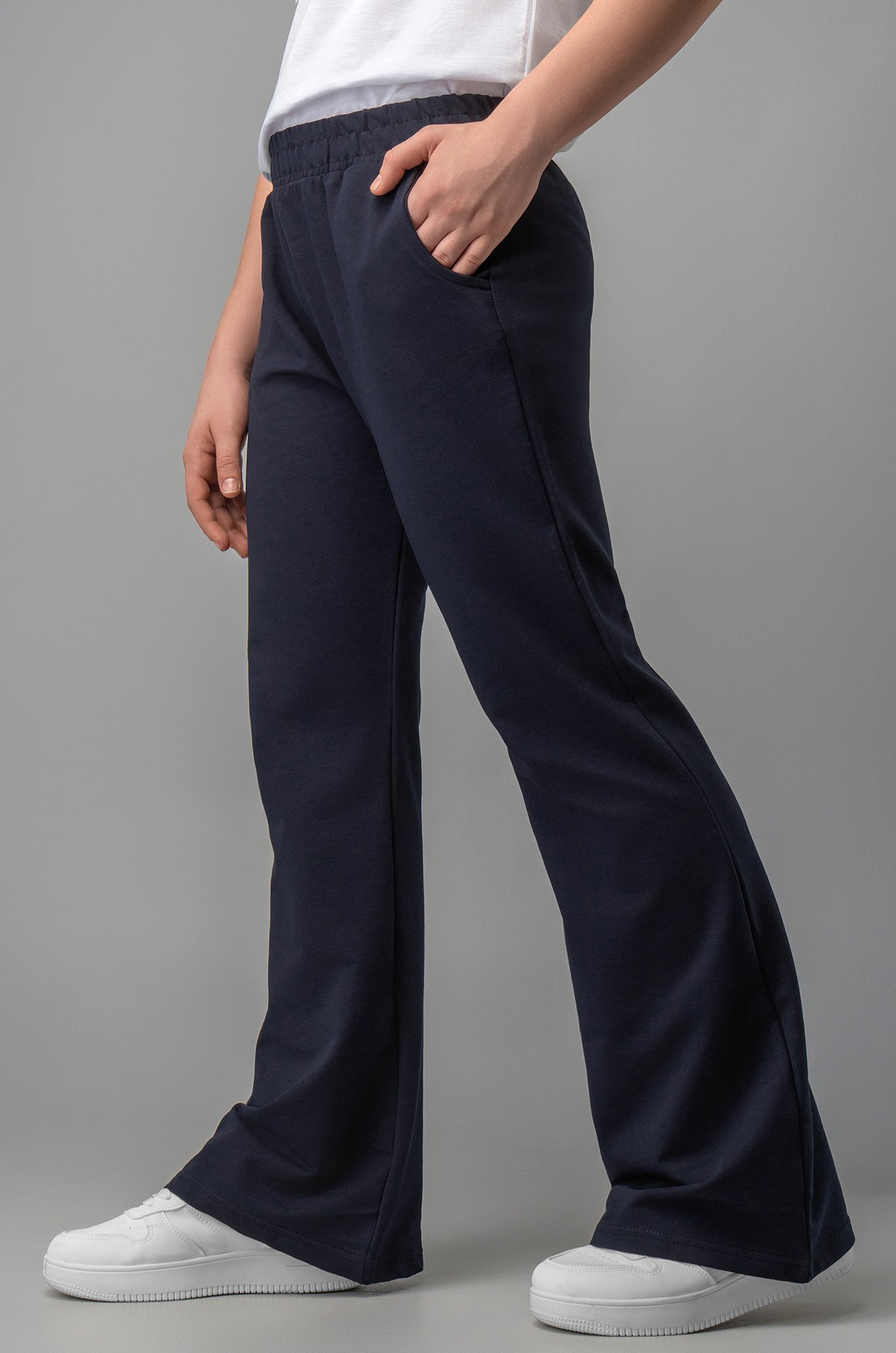 В школу – элегантной походкой! Стильные трикотажные брюки клеш для девочки и девочки-подростка выполнены из ткани футер темно-синего цвета. Детские расклешенные брюки с высокой посадкой, пояс на эластичной резинке, по бокам предусмотрены удобные карманы.