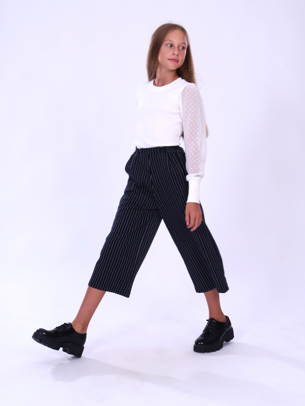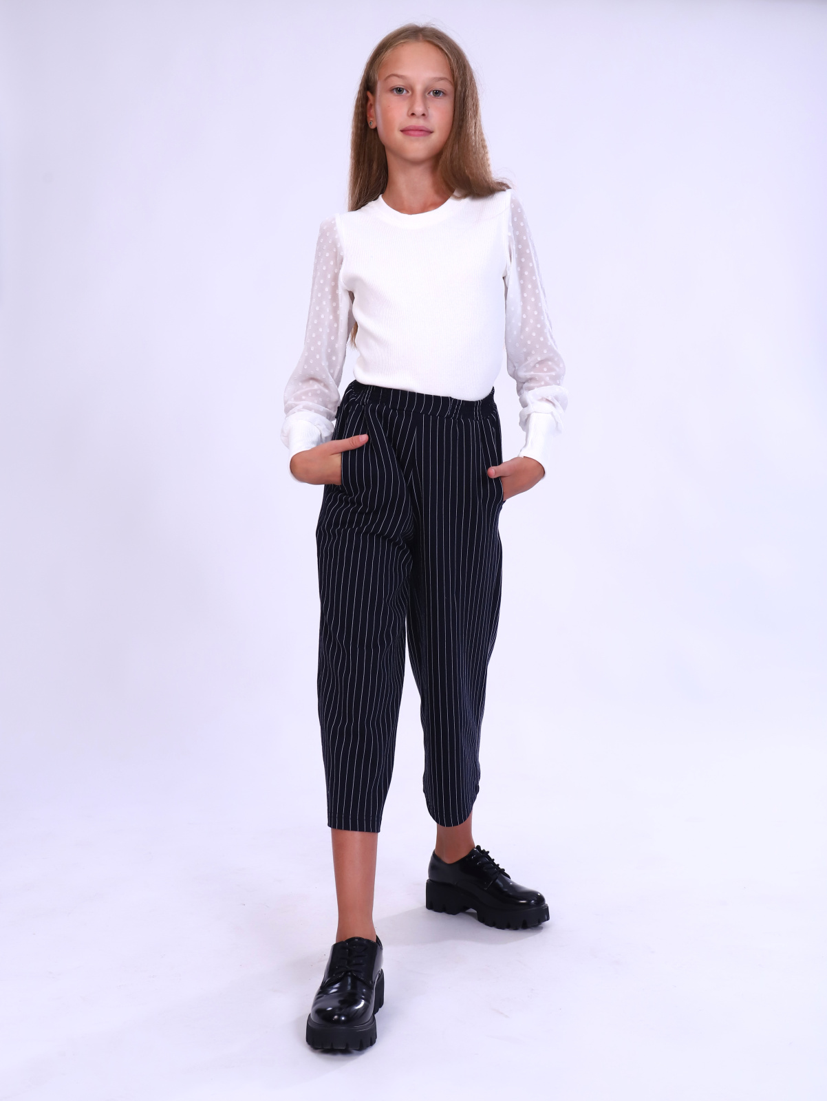 Детские брючки можно сочетать с футболкой, блузкой, рубашкой, лонгсливом, водолазкой, жилетом, джемпером, кофтой, кардиганом, толстовкой, свитшотом, худи.