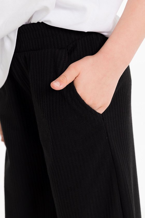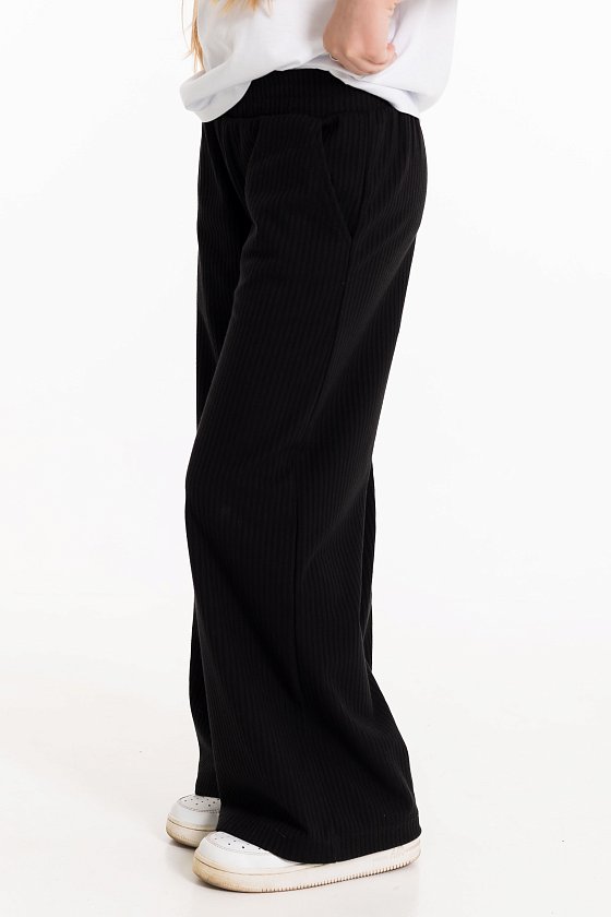 Брюки выполнены из синтетического полотна "лапша". Брюки свободного кроя, с притачным поясом и карманами по бокам.