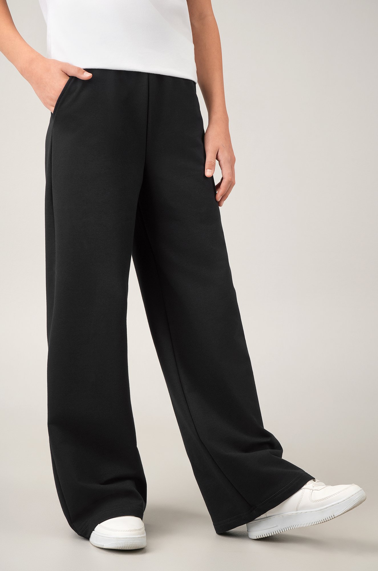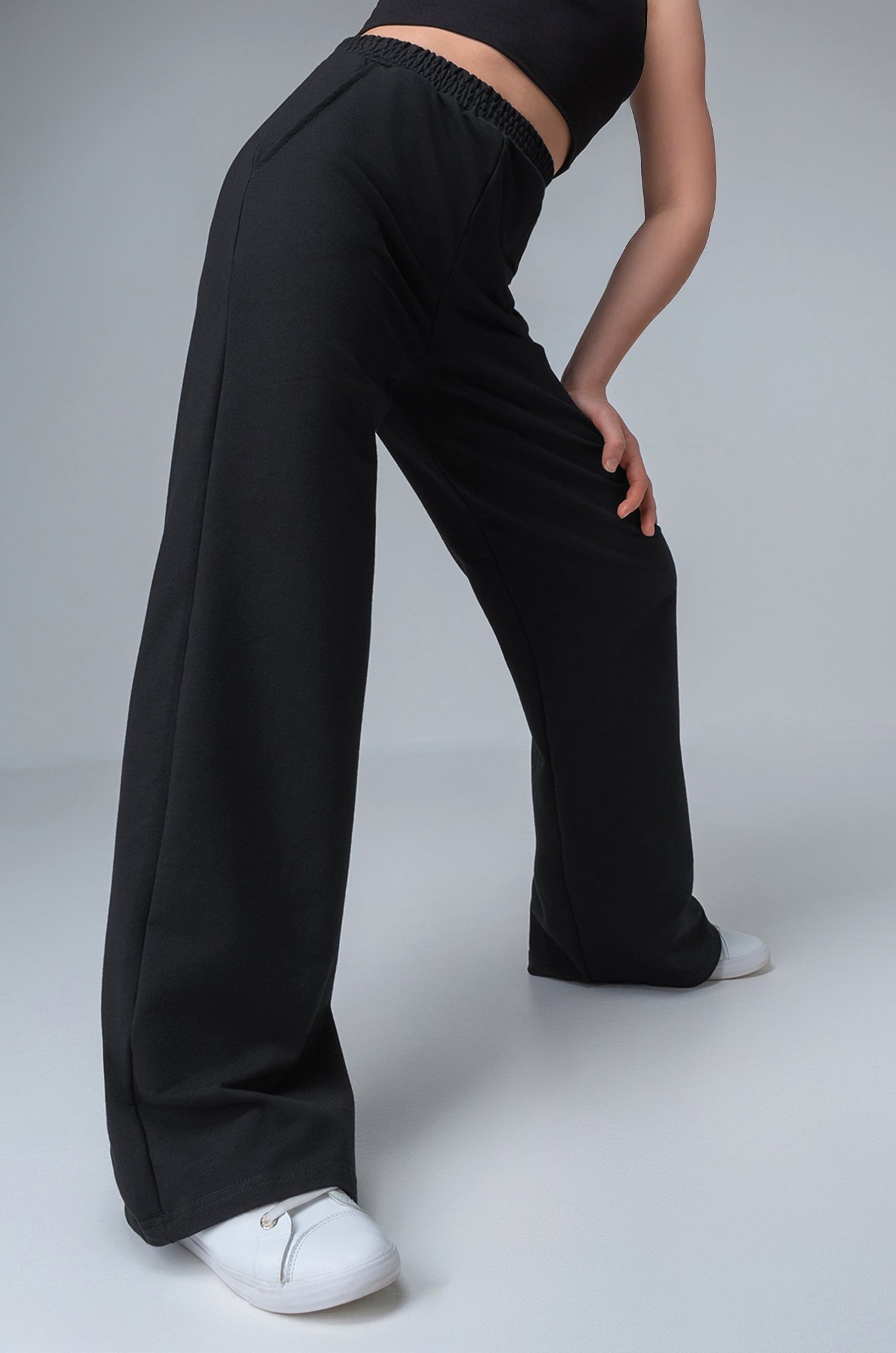 Стильные чёрные брюки для девочки добавят образу элегантности и свободы. Мягкий хлопковый трикотаж дарит комфорт и позволяет свободно двигаться.