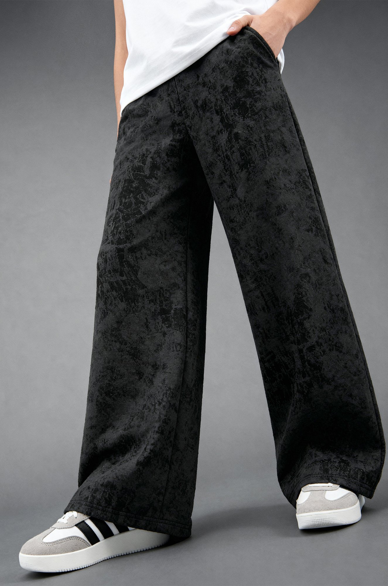 Чёрные брюки палаццо для девочки подростка с эффектом варёнка выглядят стильно и удобно в любой ситуации. Мягкий хлопковый трикотаж с потертой фактурой добавляет образу оригинальности.