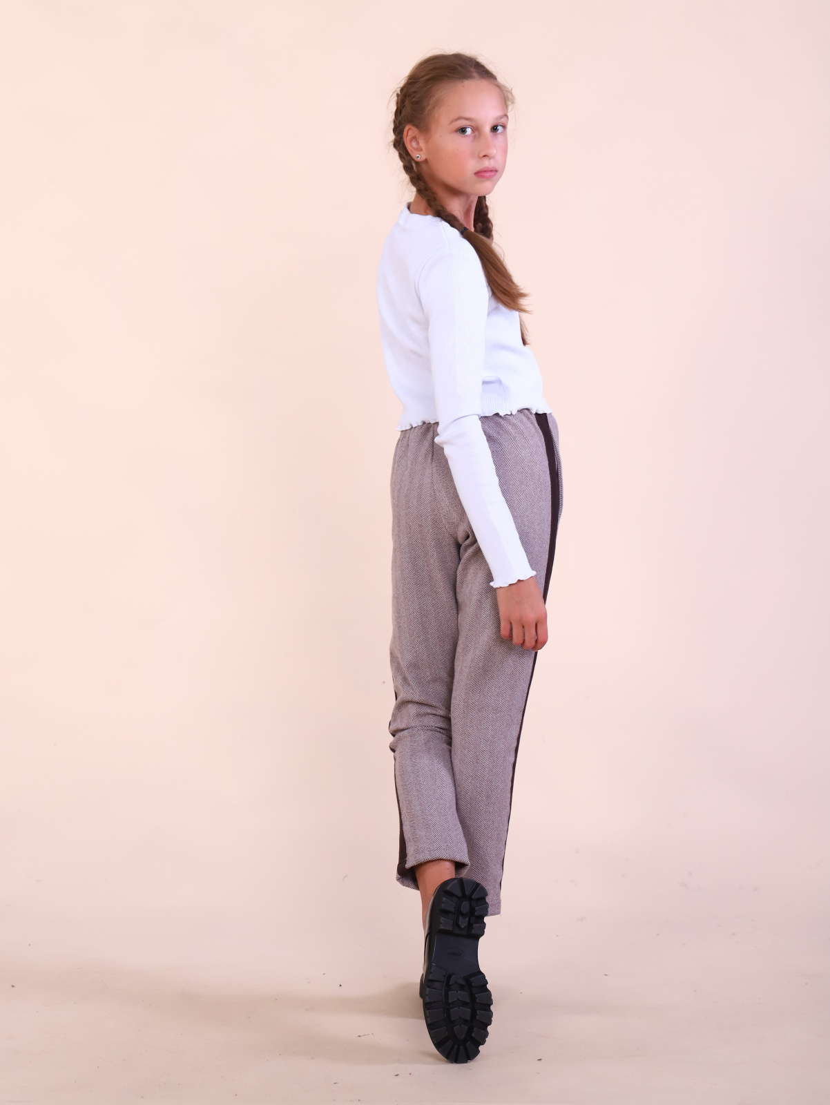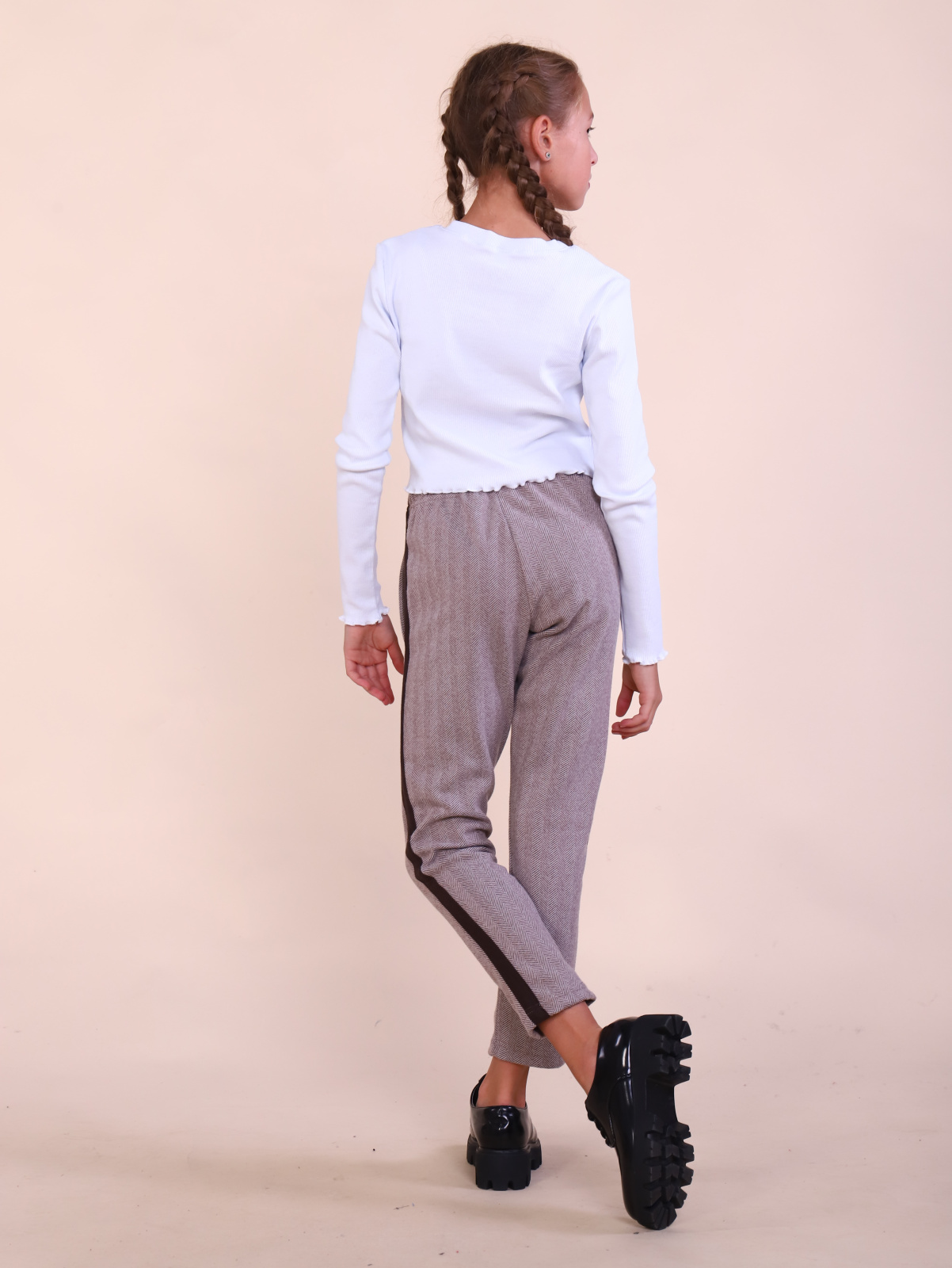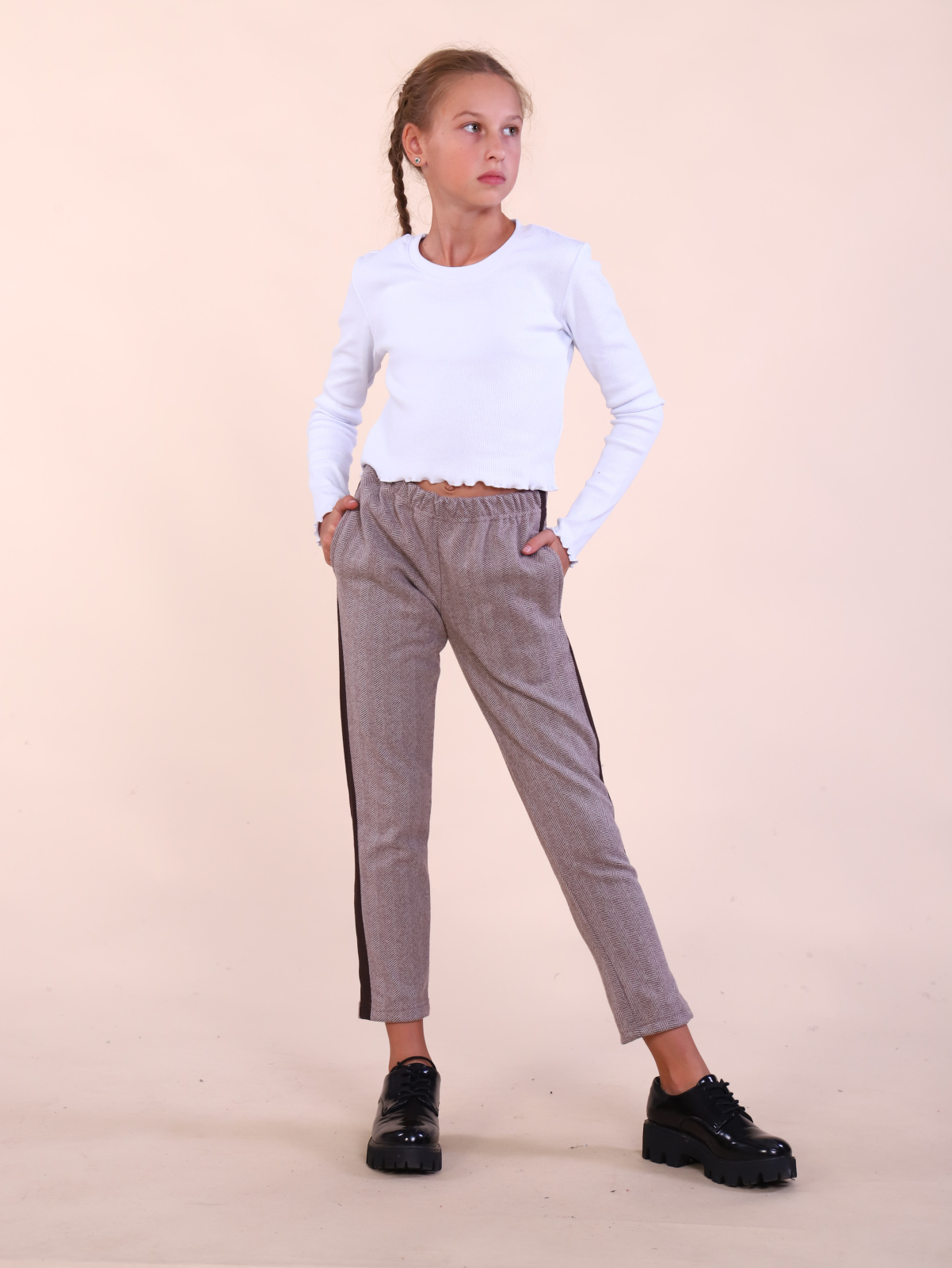 Молодежные брючки можно сочетать с футболкой, блузкой, лонгсливом, водолазкой, жилетом, джемпером, кофтой, кардиганом, толстовкой, свитшотом, худи.