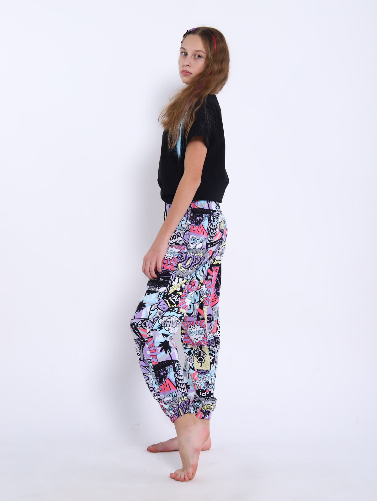 атурального материала, свободные и дышащие. Спортивки подойдут для прогулок и активных спортивных игр и соревнований . Это прекрасные брюки для повседневного ношения. Домашние дела с этих брючках очень удобно делать. Джоггеры подходят и как домашняя одежда, в них комфортно и уютно. Кто-то из ребят захочет использовать их как пижамные брюки. Будем рады, если вы оставите отзыв о наших моделях одежды. Учтём Ваши пожелания! Повседневные брюки это удобная практичная немаркая модель на каждый день. Поскольку эта летняя модель внизу на резинке, ее можно выбирать с небольшим запасом по длине, они сядут на ножку ребенка удобно. Спортивные трико можно использовать как пляжные. Они подойдут и девушкам и юношам, поскольку ростовка этой модели легких штанов до 170 роста. Модный яркий принт граффити с машинками.