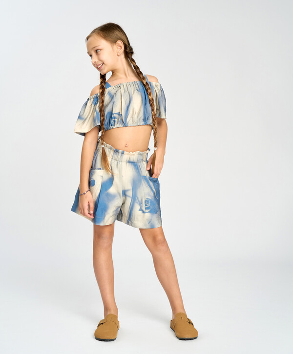 1470 р. 2100 р. Шорты для девочки расклешенные принтованные с поясом на резинке мультицвет Button Blue
