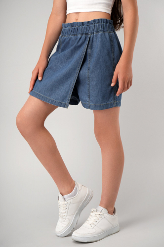 Обтягивающая детская юбка шорты дарит комфортную посадку по фигуре. Запах имитирует мини-юбку спереди. Пояс сзади на эластичной резинке, поэтому юбку легко надевать и снимать.