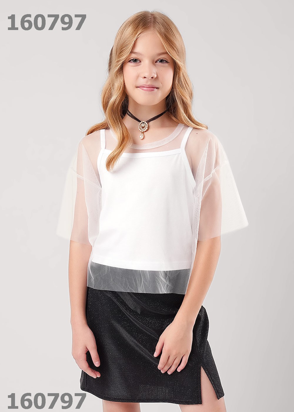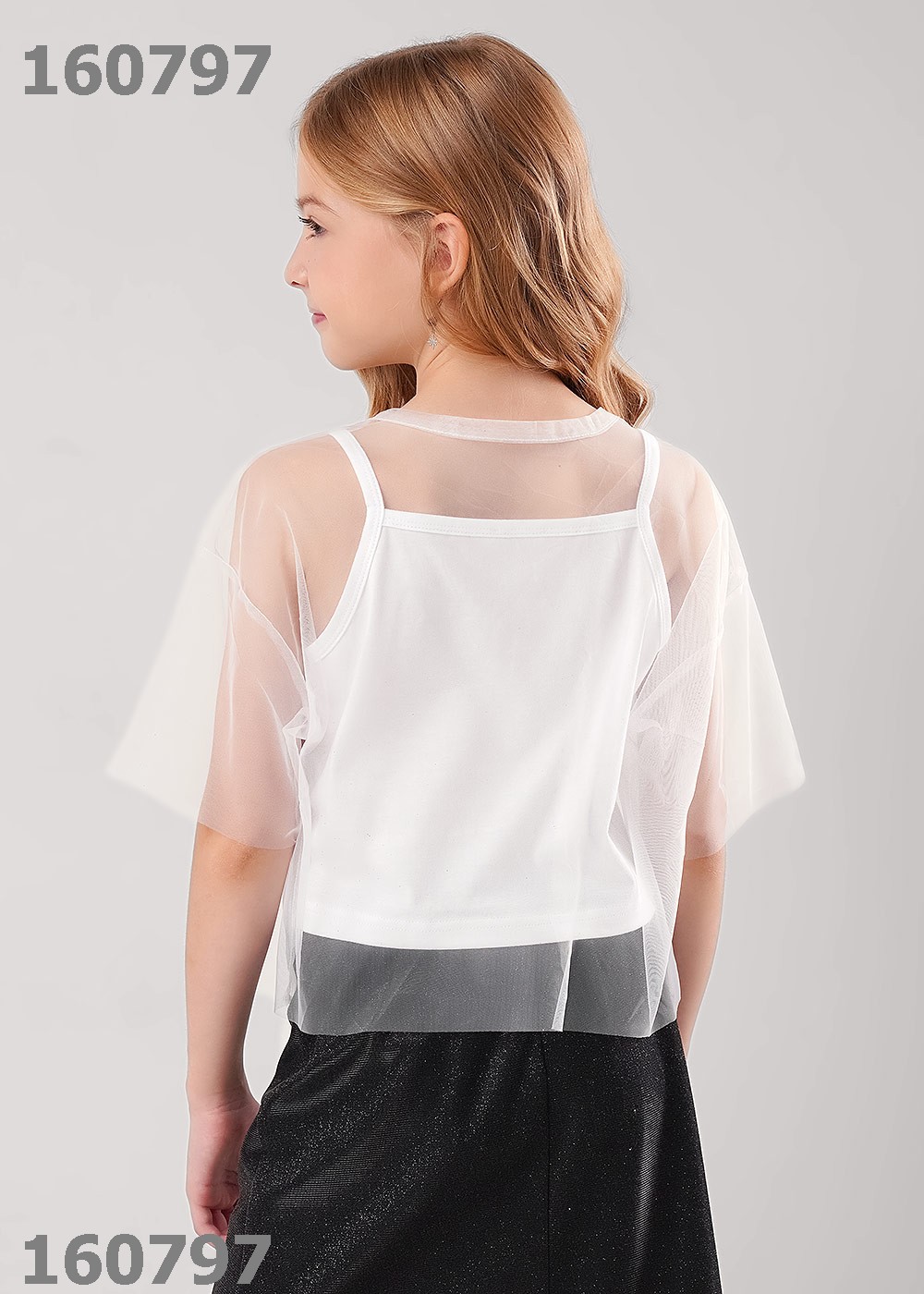 "Описание: Двухслойная футболка для девочки. Рукава и верхний слой выполнены из сетки, нижний слой - из хлопкового трикотажа с эластаном. Свободная посадка. Стильная модель для праздника.