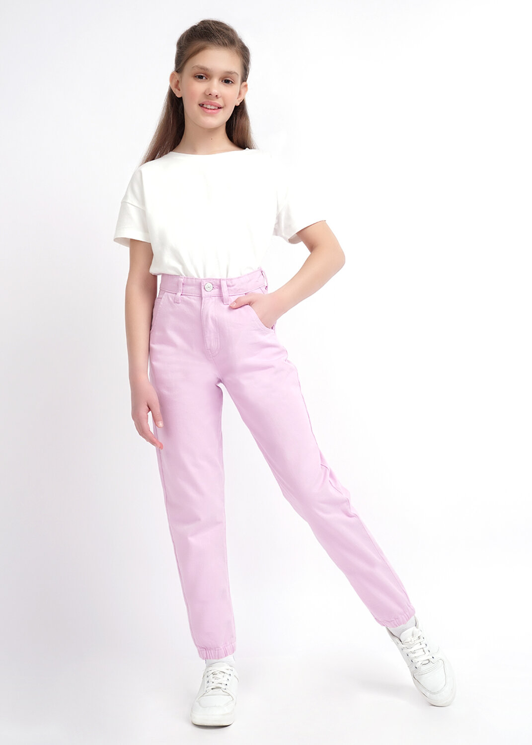 Брюки Joggers из легкого хлопкового материала. Спортивная модель свободного покроя на бедрах и постепенно сужающиеся к низу ног. Главная особенность брюк- резинка на щиколотке. Пояс на резинке и шнуре. Карманы спереди и один сзади.