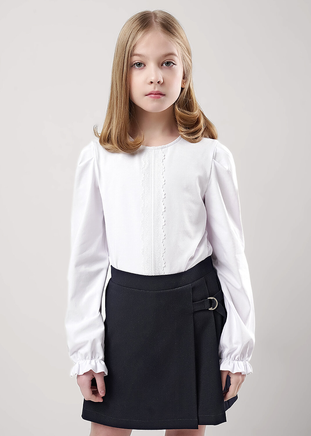Стильная блузка станет отличным дополнением к вашему гардеробу! Модель выполнена из хлопкового полотна с добавлением эластана. Блузка дополнена декоративной деталью из кружева и отлично подойдет для создания повседневных и школьных образов!