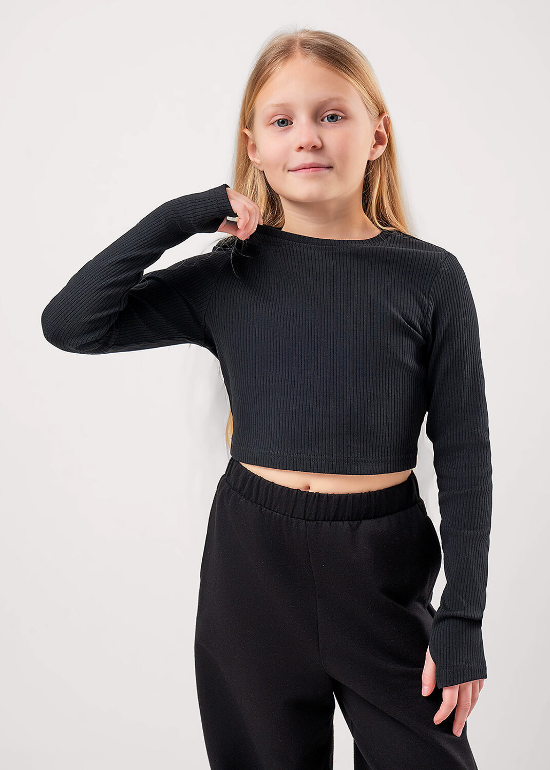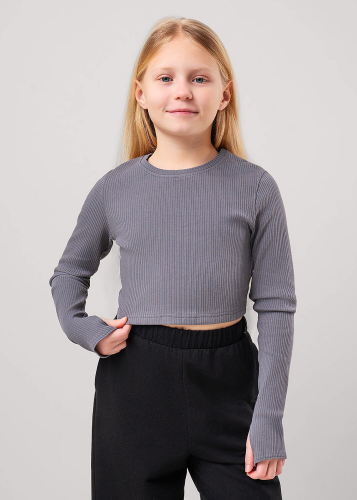 Стильный укороченный лонгслив из лапши станет отличным дополнением к твоему гардеробу. Фишка -отверстие на рукаве под палец. Модель прекрасно сочетается с брюками из новой коллекции. Составляй классные стильные образы и будь в тренде!
