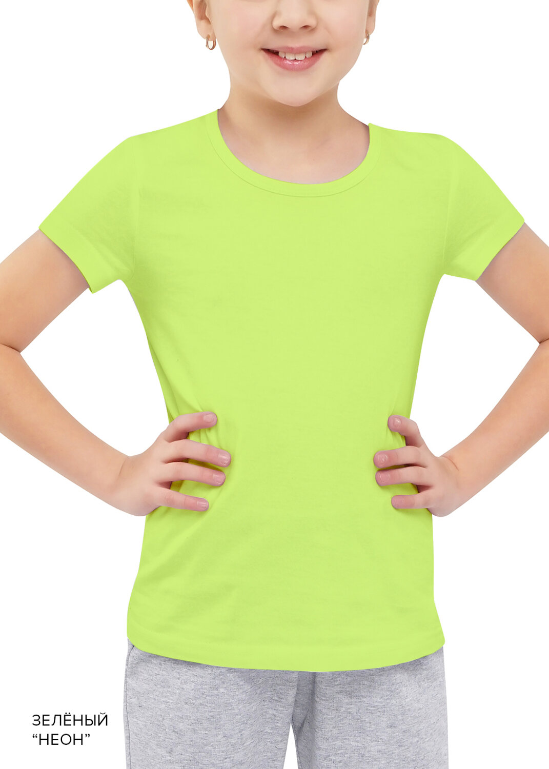 Базовая футболка для девочки из хлопка малого объема с коротким рукавом. Горловина круглая с окантовкой.